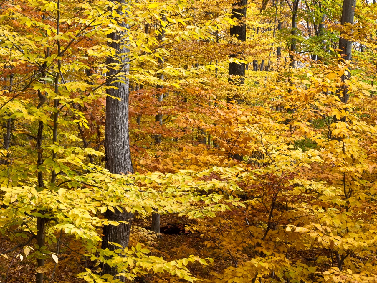 As I hike along, stopping to set up and make a few photographs, the path transitions from field into pine plantation. Finally I crest the moraine and look down into a sea of golden yellow. Of course, the maples have all dropped, but the beech trees are now broadcasting their autumn glory. Soon the sun starts peaking through the morning cloud and the forest becomes a fireworks show of colour. The subtle colour I came out today to photograph have erupted. What a treat.