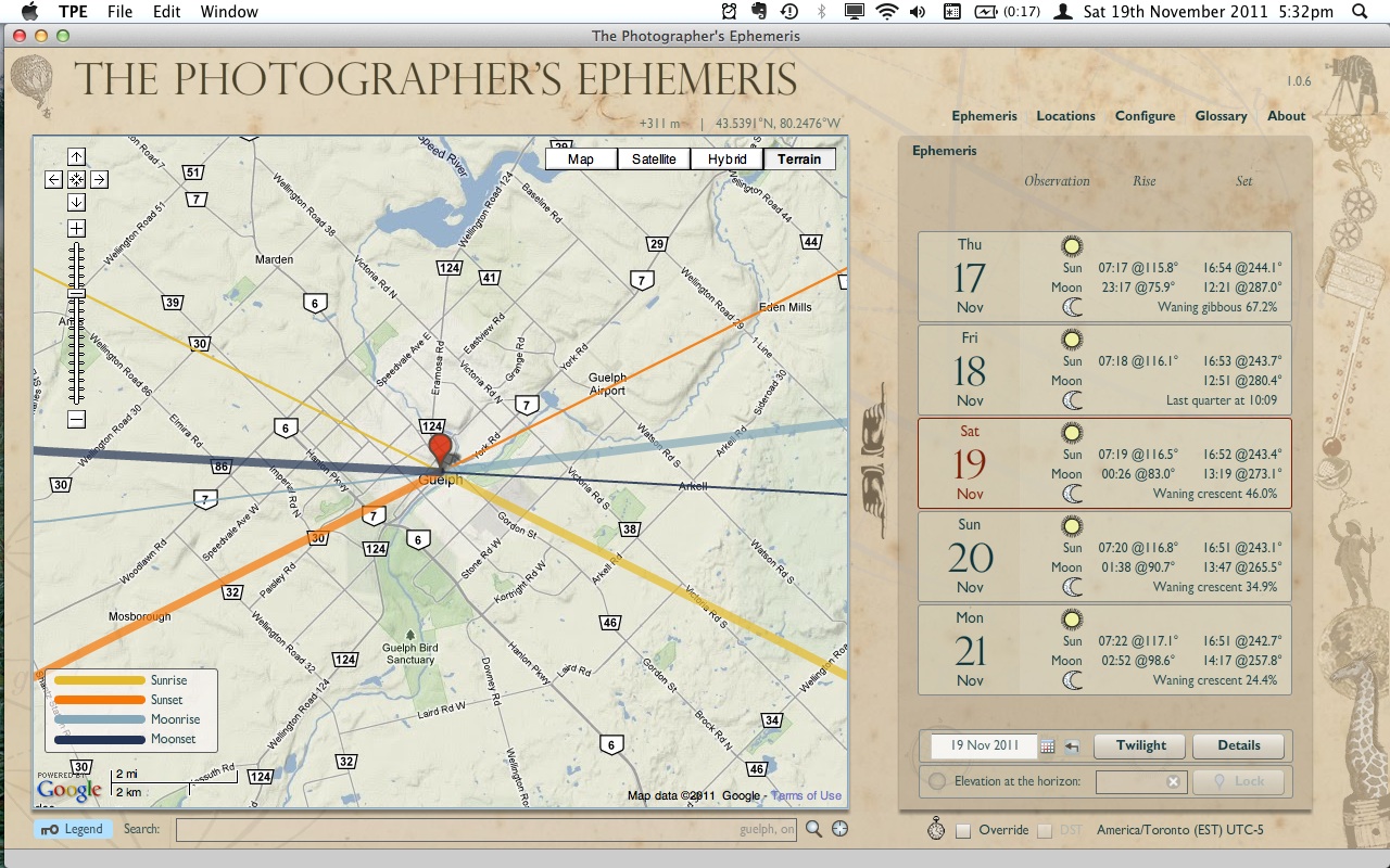 For landscape photographers it is a truly unique tool that allows you to plan your shooting: sunrise, sunset, moonrise, moonset – all on a terrain map. You can add locations, toggle between multi-day and details for one day and it gives Latitude. Longitude and Elevation data. I especially like the option of added notes about each saved location. It is also pleasing to look at and use – great graphics. About the only thing it doesn’t seem to do is predict the weather! You can find this great app at StephenTrainor.com. Oh – and did I say that it is free for desktop/laptop computers? Thanks Stephen!