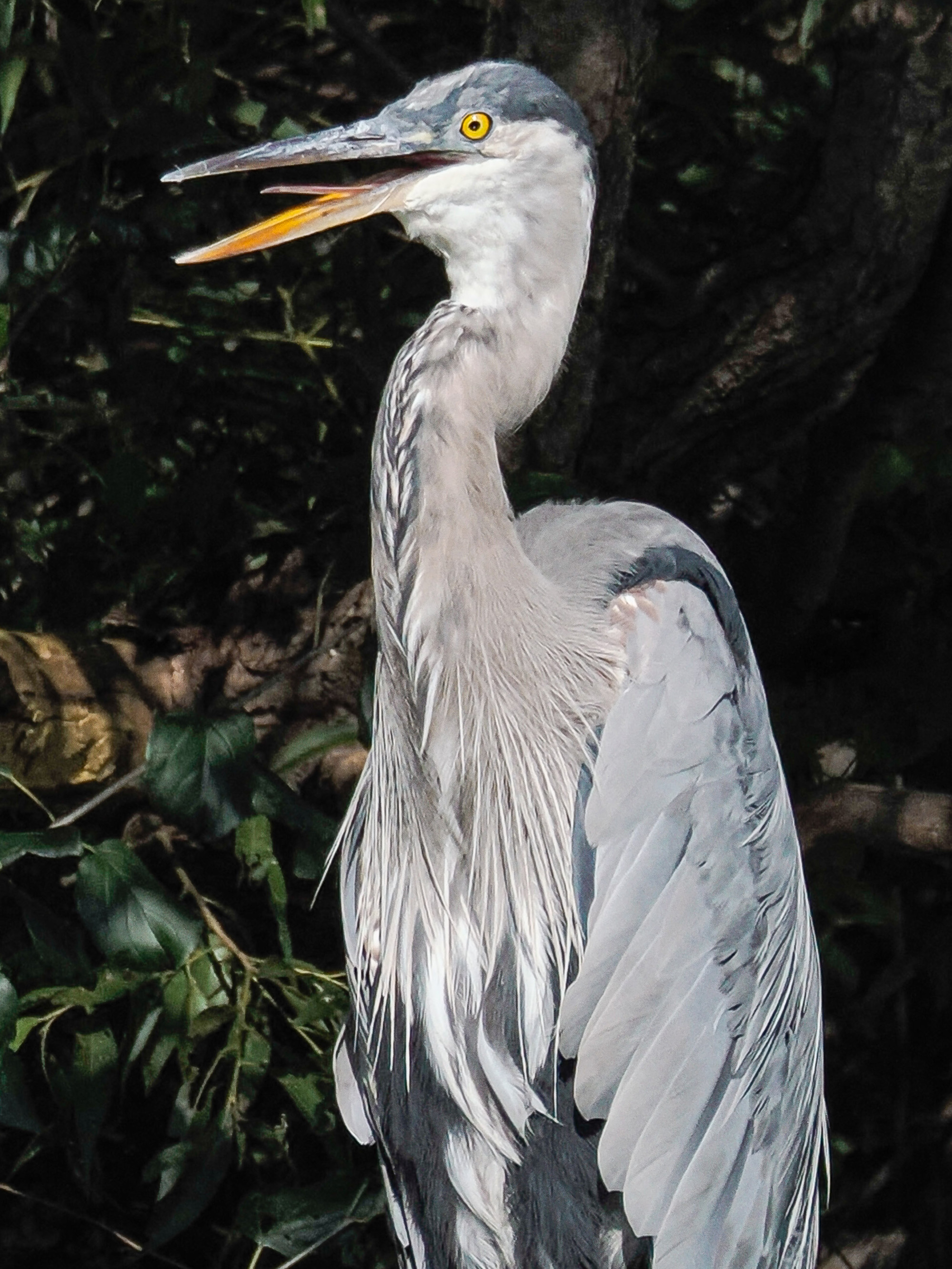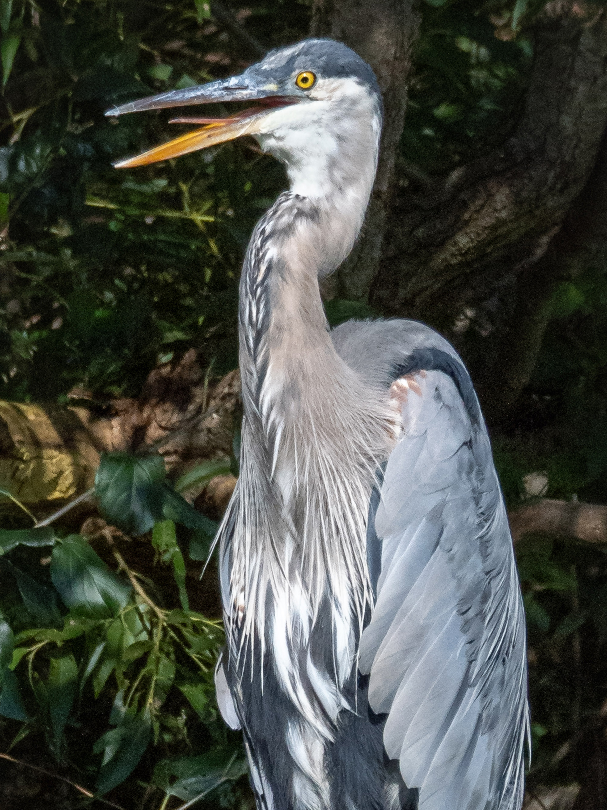 Overall, the detail is about the same. Check the really fine short feathery bits sticking out at the back of the neck and at the top of the back. The detail is the same, but the clarity of the surrounding background allows those details to stand out more clearly. As well, with the denoised image, there isn’t the distracting graininess through the neck and breast feathers.