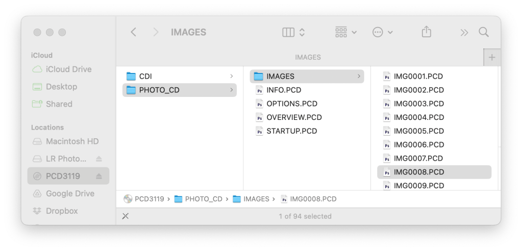 I was heavily invested in film photography from the mid-1970s right through to the early 2000s and have thousands of 35mm slides, 6×7 and 4×5 transparencies. However, back then, I took advantage of slide scanning tech offered by Kodak (who? you ask!!), to preserve my slides forever as digital files. So I have about 300 of my best slides from then, scanned to 3 Kodak Photo CDs. The trouble now is I can’t ‘read’ them. Neither my current MacOS nor Photoshop2024 can read PCD files. The Photo CD disk could be read by the Finder, but nothing I tried would open the file and, over the years, I’ve developed a few tricks and workarounds for file formats. Nothing I tried worked! Yikes!