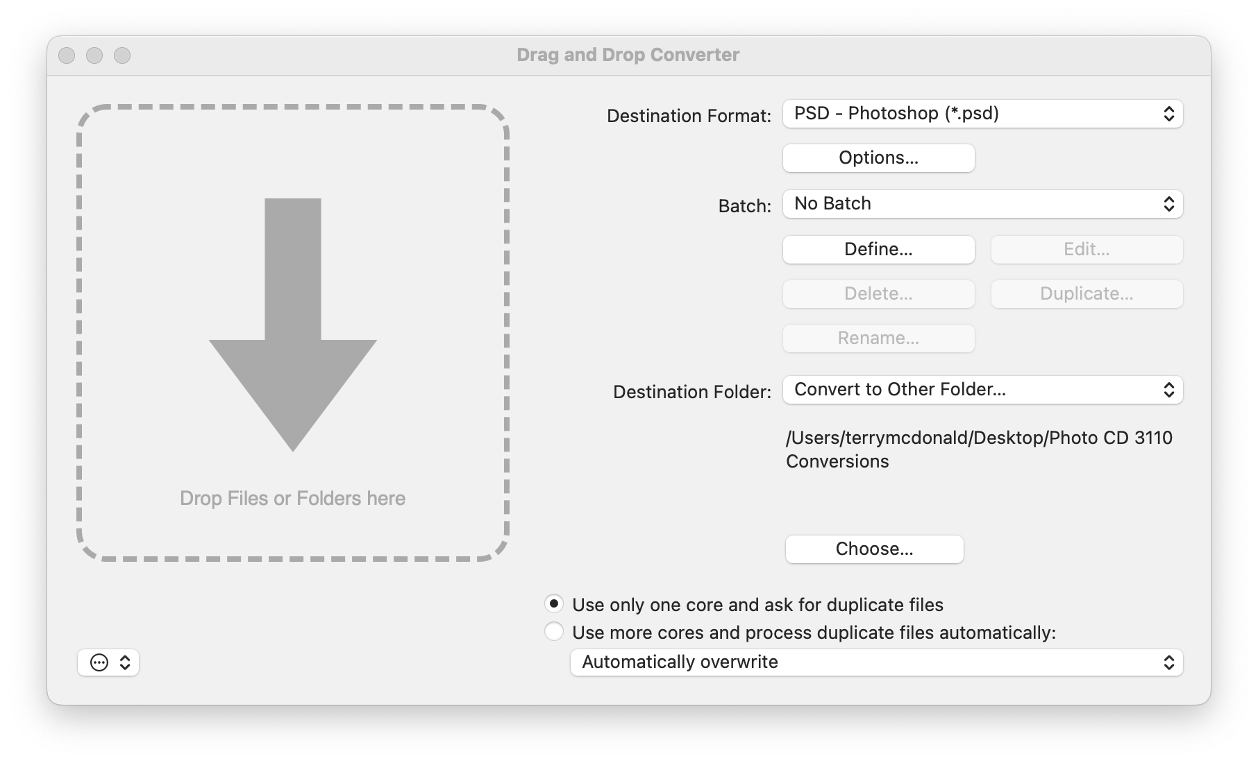 I really like the way I can batch convert either through the drag-and-drop option (pictured) or through the usual interface. I can also select from a number of different file formats for saving (though DNG is not supported), and I can easily specific which folder to save it to. In ten minutes I had 94 PCD files converted to PSD and added to Lightroom CC.