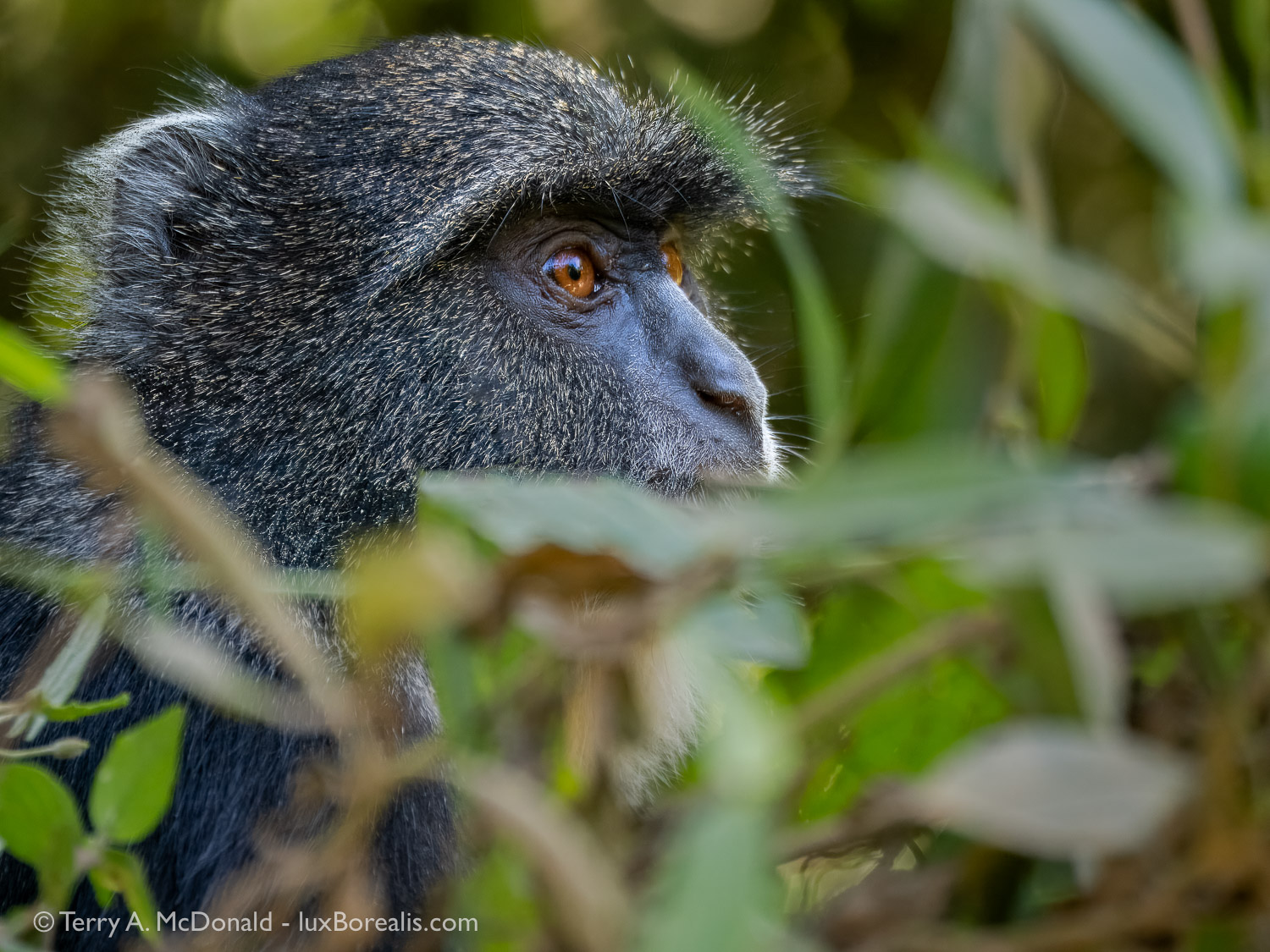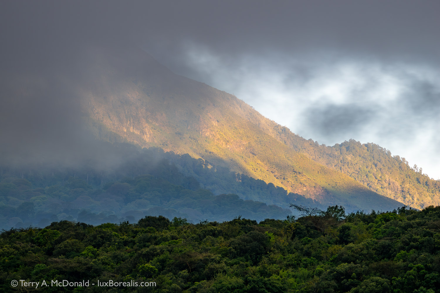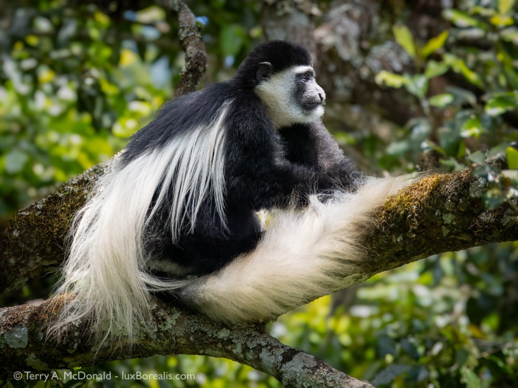 The rich cloud forest that wraps around Mount Meru is home to Blue Monkeys and Colobus Monkeys (see below), elephants, Cape buffalo, bushbuck, and a host of other mammal and bird species. Photographing in the deep shade is challenging with shutter speeds slower than ideal when wildlife and the branches they sit on are never still.