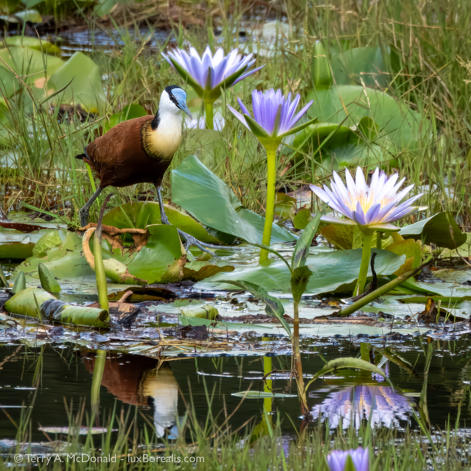Day 3, 3:04pm; 400mm (800mm efov); ƒ11 @ 1/800, ISO 1600; Lightroom + Topaz Photo AI. The jacana is a beautiful marsh bird with great, long toes to walk on lily pads, but it would not approach closely. This is a file was a perfect candidate for upsizing in Topaz.
