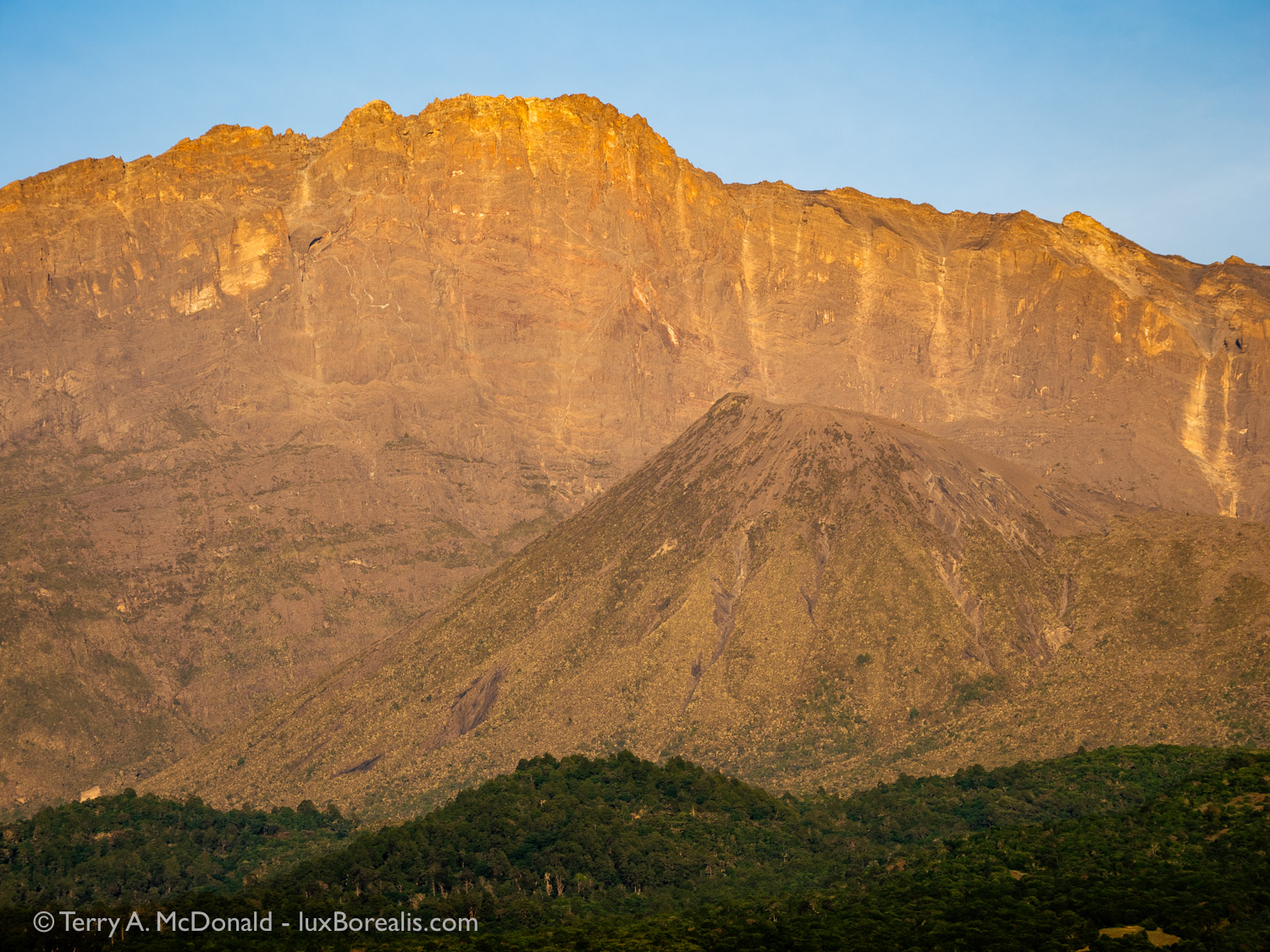 Mount Meru, Tanzania’s second-highest peak, was a once a typical conical volcano. Similar to Mount St. Helens, it blew its eastern side away. Since then a new cone developed, though there hasn’t been any activity for over a hundred years. The ‘wall’ shown here, from the top to the base of the new cone, is one of the highest vertical drops in the world at 1.5km.