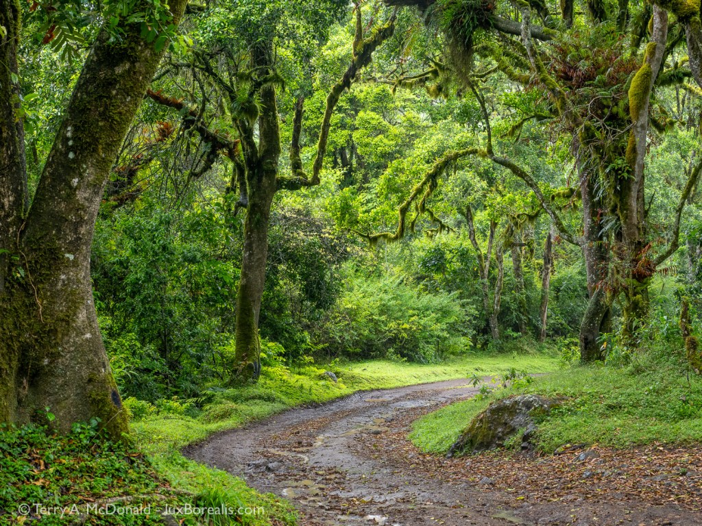 Getting up into the forested area was more difficult than we imagined as the road was in dreadful condition (though it looks smooth here!) Even our driver was upset by the lack of maintenance by park officials. However, it was quiet, very quiet, green (very green), and was dripping with moss, epiphytes and ferns, and a few raindrops as well.