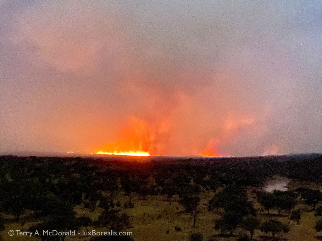 One of the realities of Africa is that famers still use fire to burn crop residues to fertilise the next crop. This fire got out of control and entered the park, burning grasses but not trees, contributing significant air pollution and tiny black cinders of burnt grass that covered everything. The subsequent bonus was that it drove the antelopes, zebras and wildebeest northwards, followed by lions, of course.
