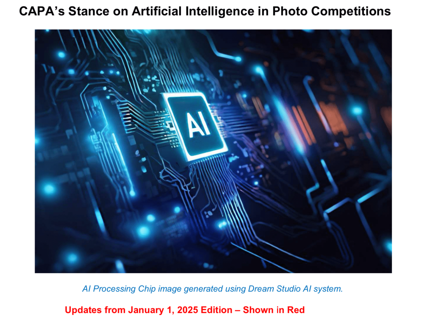 Case in point: the Canadian Association of Photographic Arts (CAPA) has gone to great lengths to create a detailed, 15-page document (LINK) which specifies exactly what tools can and cannot be used within a number of commonly-used editing apps. For example, with Lightroom, you may use the ‘Remove’ tool, but not with ‘Use Generative AI’. With Photoshop, you may use some Neural Filters, but not all, as pointed out above.