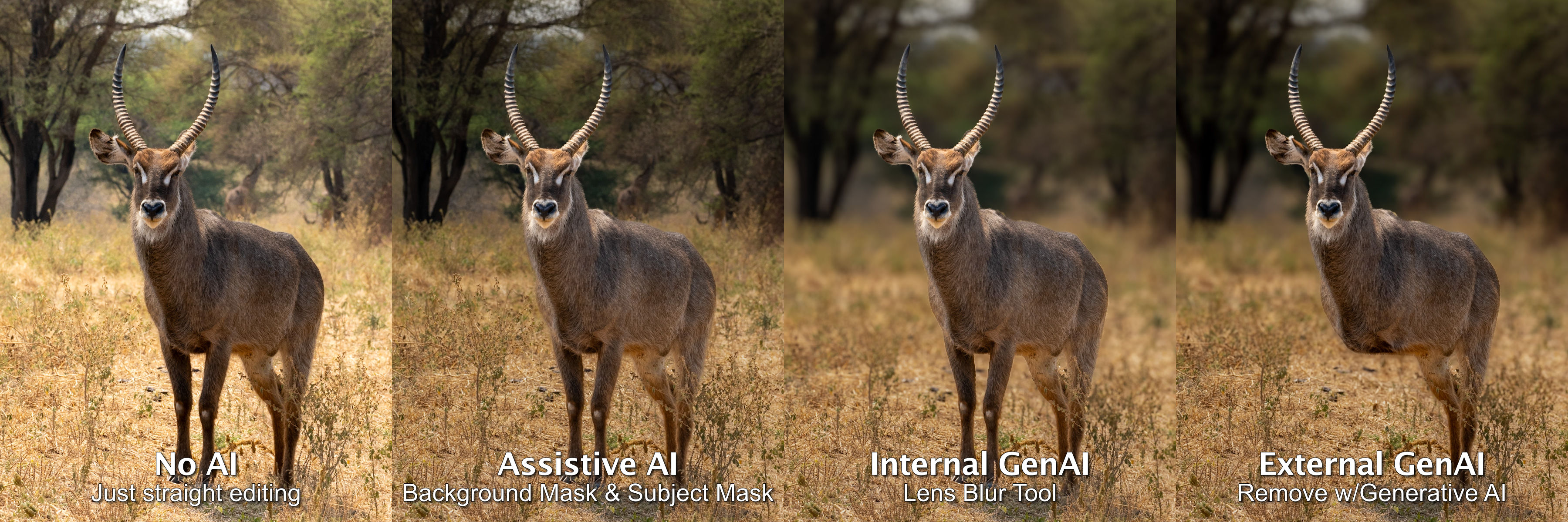 The difference with GenAI is that it creates new pixels in an image. But even GenAI comes in two flavours: internal and external. Internal GenAI analyzes the pixels within the image, then uses them to create pixels, kind of like cloning but more automated and on steroids. On the other hand, External GenAI uses AI algorithms to create pixels entirely new to the image, taking them from third-party photographs—photos that are not your own.