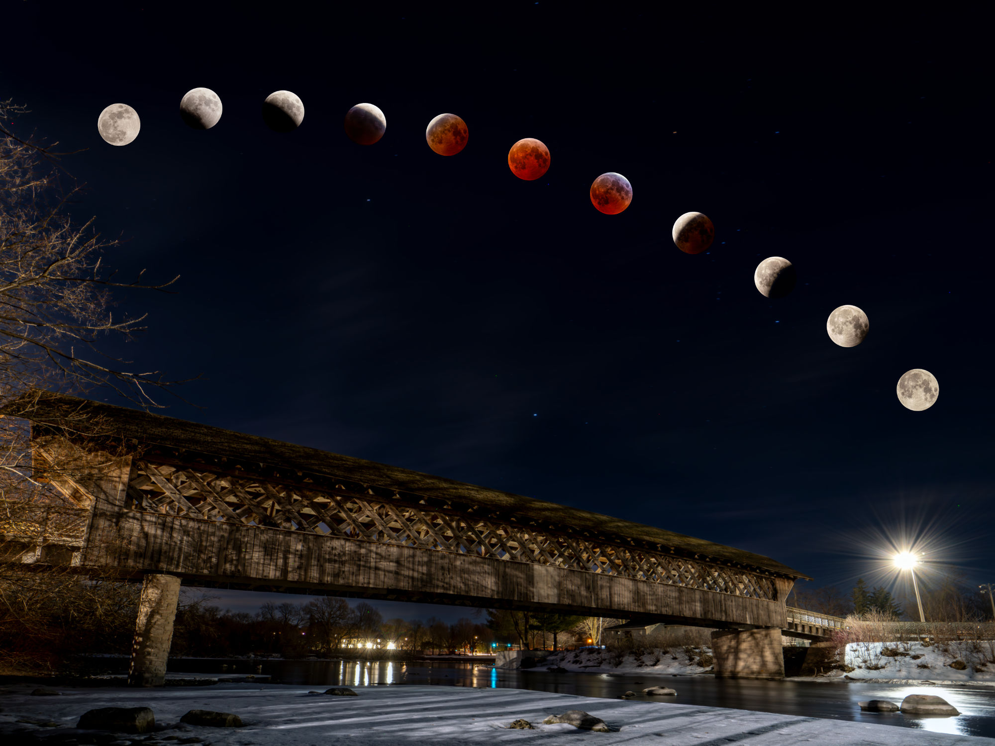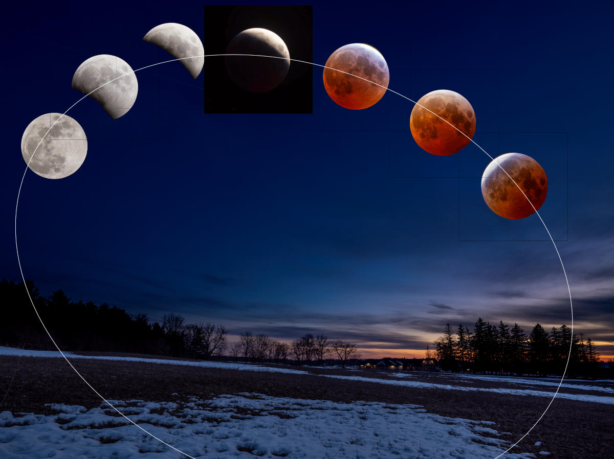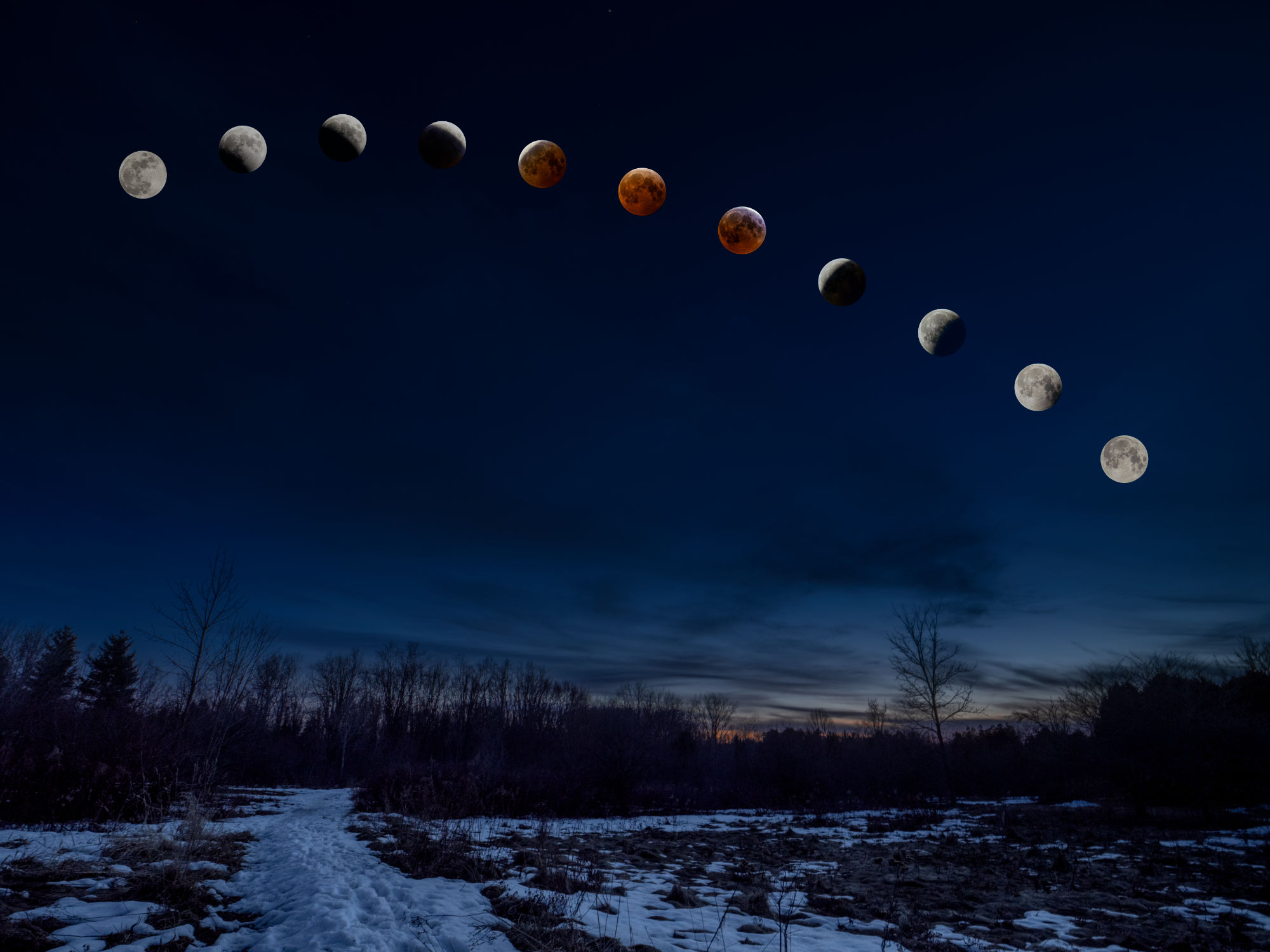 Total Lunar Eclipse—Landscape Composite Photographs around Guelph, Ontario
