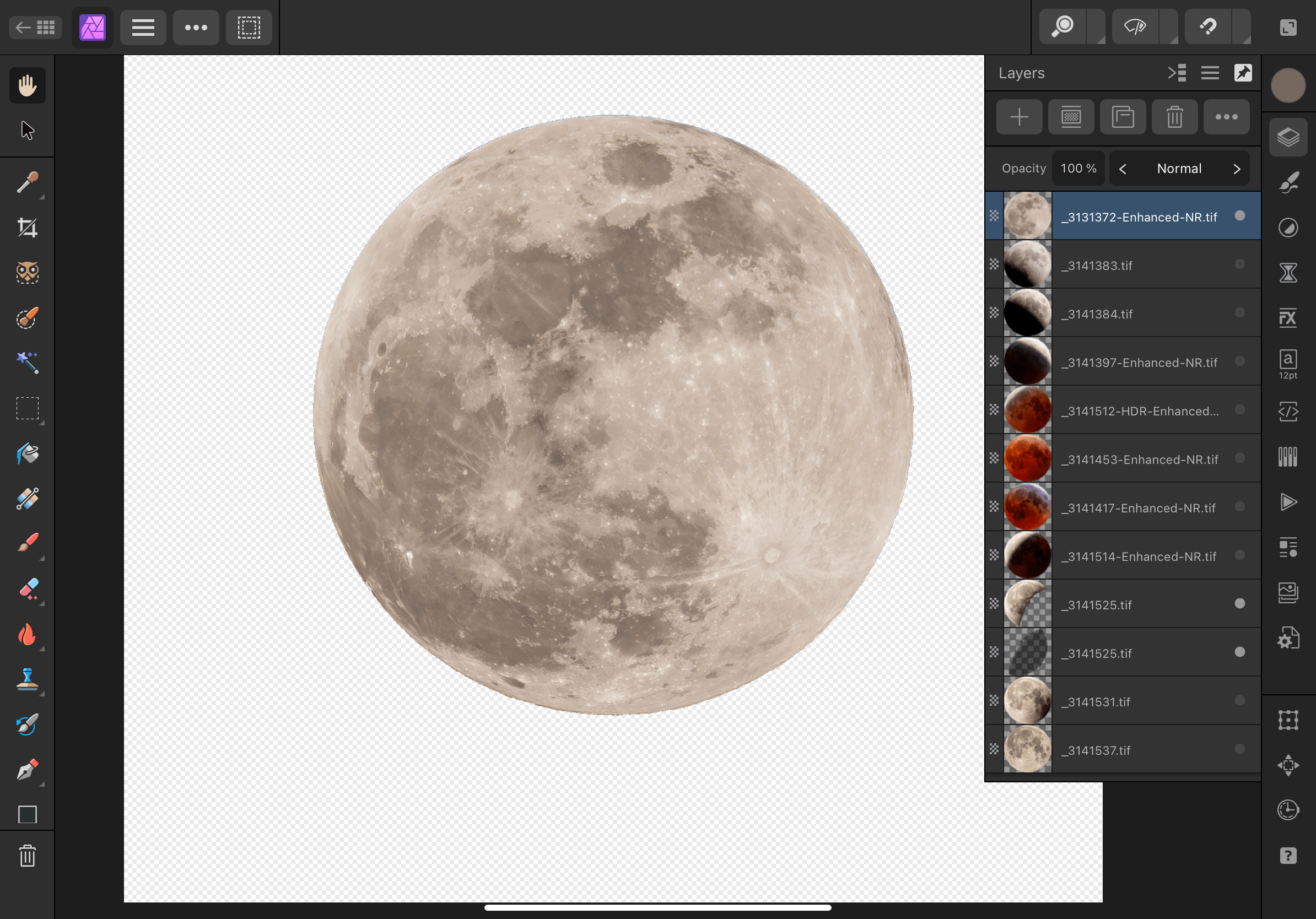 At this point, I exported the 11 Moon images from Lightroom as 16-bit TIFF files. I could have used JPEGs but, with compression and sharpening, they reduce overall image quality. The TIFFs were then brought into Affinity Photo as a ‘New Stack’. In Lightroom, I had carefully cropped each photo to centre the Moon and to maintain phase-to-phase consistency, but I wanted the circles of the Moon aligned, so I toggled on ‘Align Source Images’. The app did precisely as directed, and I carried on. The Stack was ungrouped allowing me to work on each layer individually. I could have set them up as 11 different files, but opening and closing each file would have become tedious. Working on them as 11 layers was much easier. My goal was to remove the black background of the sky, leaving just the Moon on a transparent background.