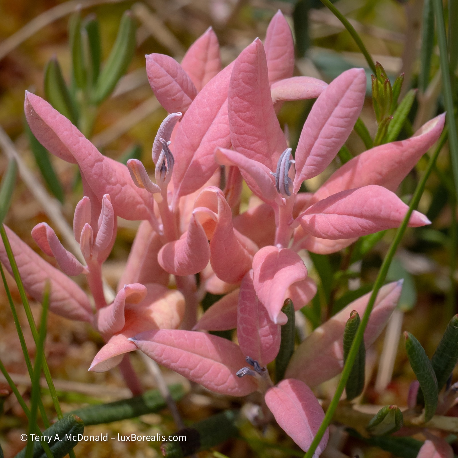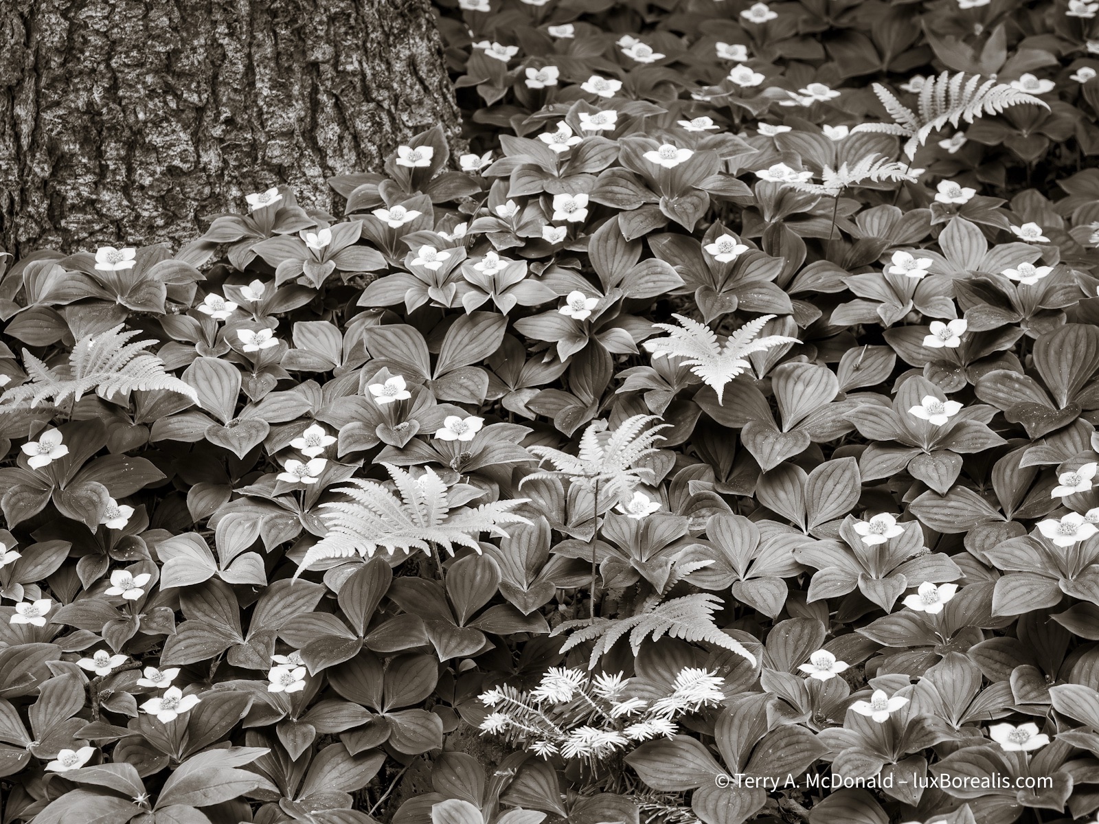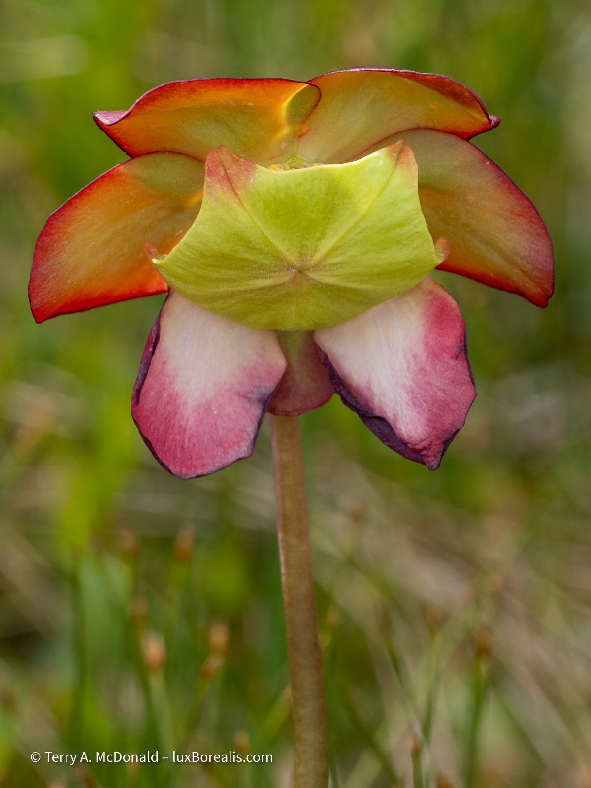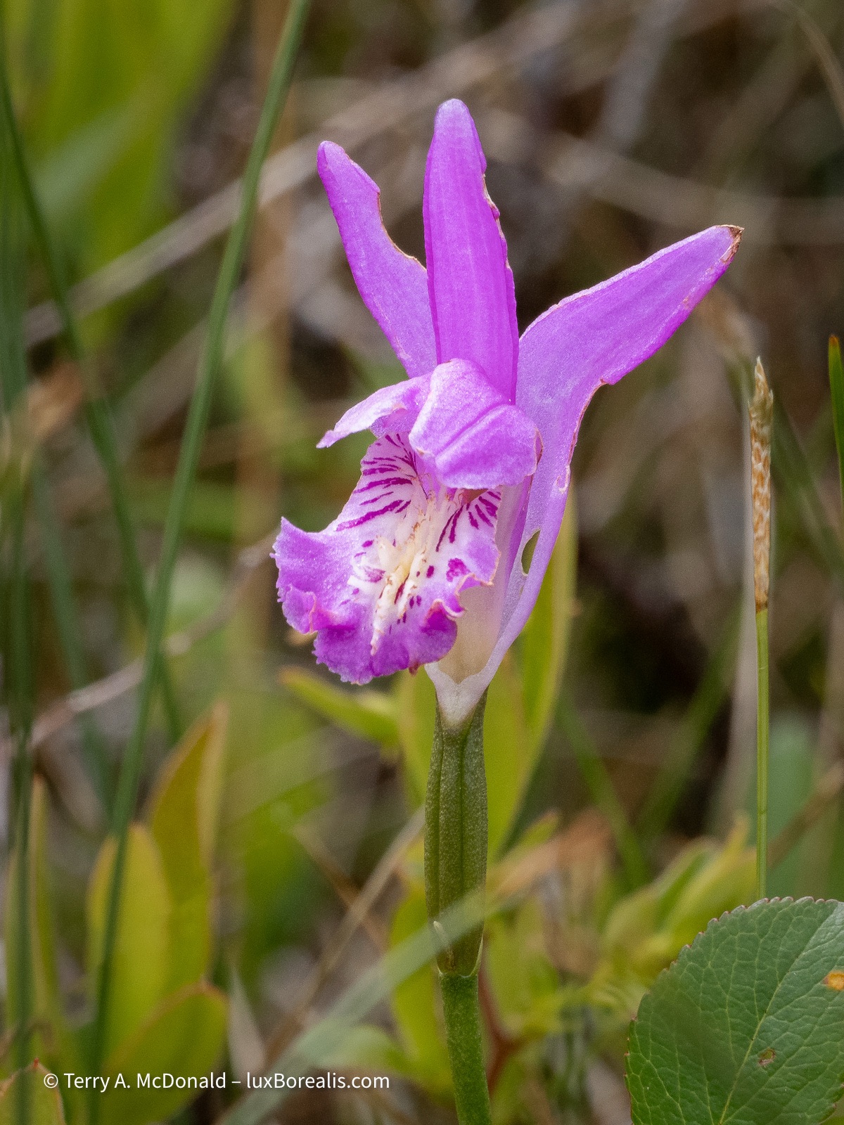 Always a highlight is a visit to a bog; in this case a bog-like sloped fen. The Bog Trail at Cape Breton Highlands National Park is exceptional, not just for its extensive boardwalk, but also for its wonderful diversity. Besides all the usual pitcher plants, tamarack, sphagnum moss, etc., there were a few new species of orchids plus a completely new discovery for us: a fungus that invades a plant and turns the green leaves to a soft coral pink.