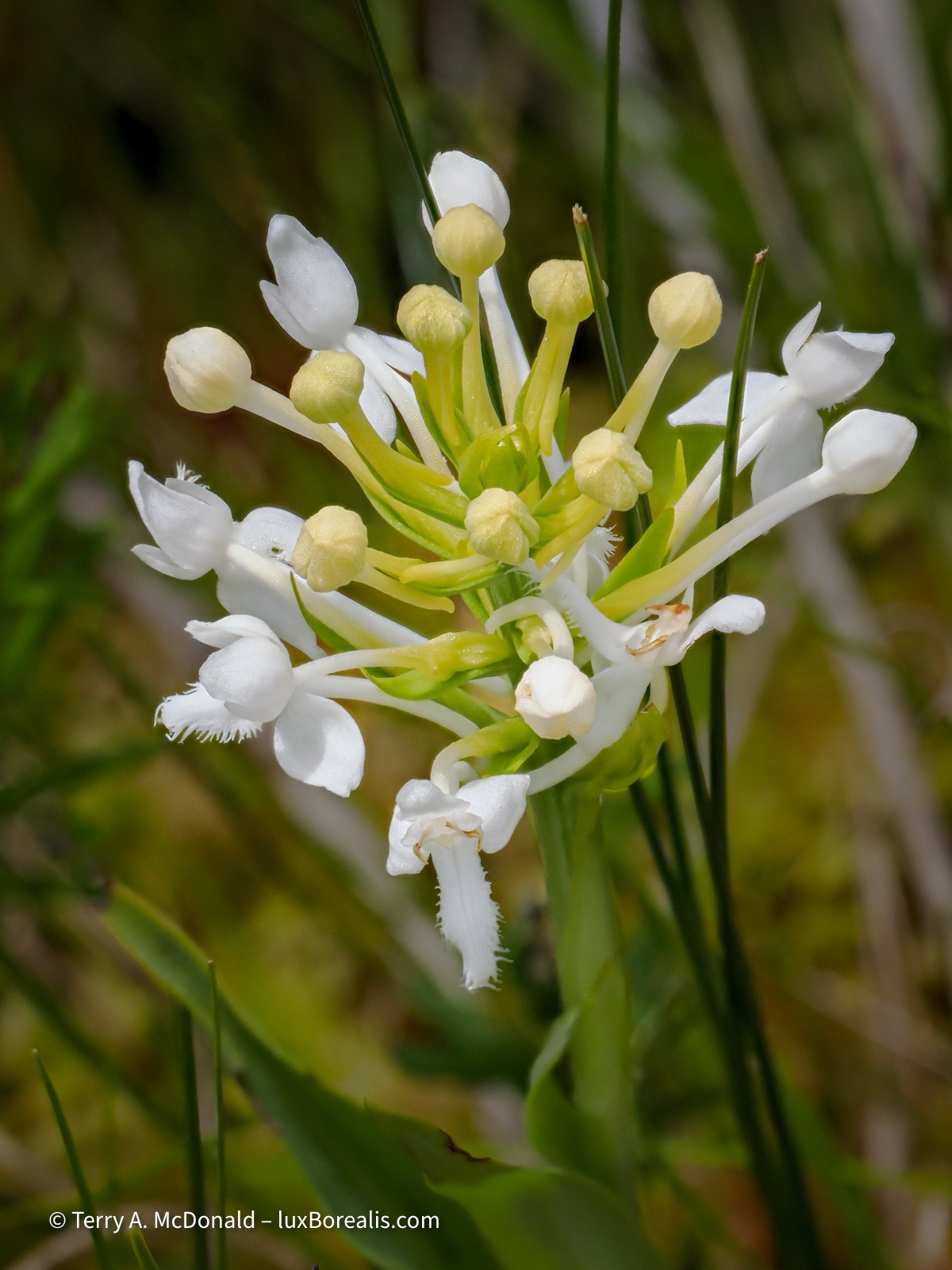 The challenge was the wind. Being at the top of a flat-topped hill over 400m in elevation right next to the sea means all that wind at sea level gets squeezed as it’s forced up and over the hills. So, yes, wind was a challenge. Thank goodness for high ISOs and fast shutter speeds. There was one lull in the wind that allowed me to make a Focus Stack of the White Fringed Orchid. But, the wind can also provide a creative advantage.