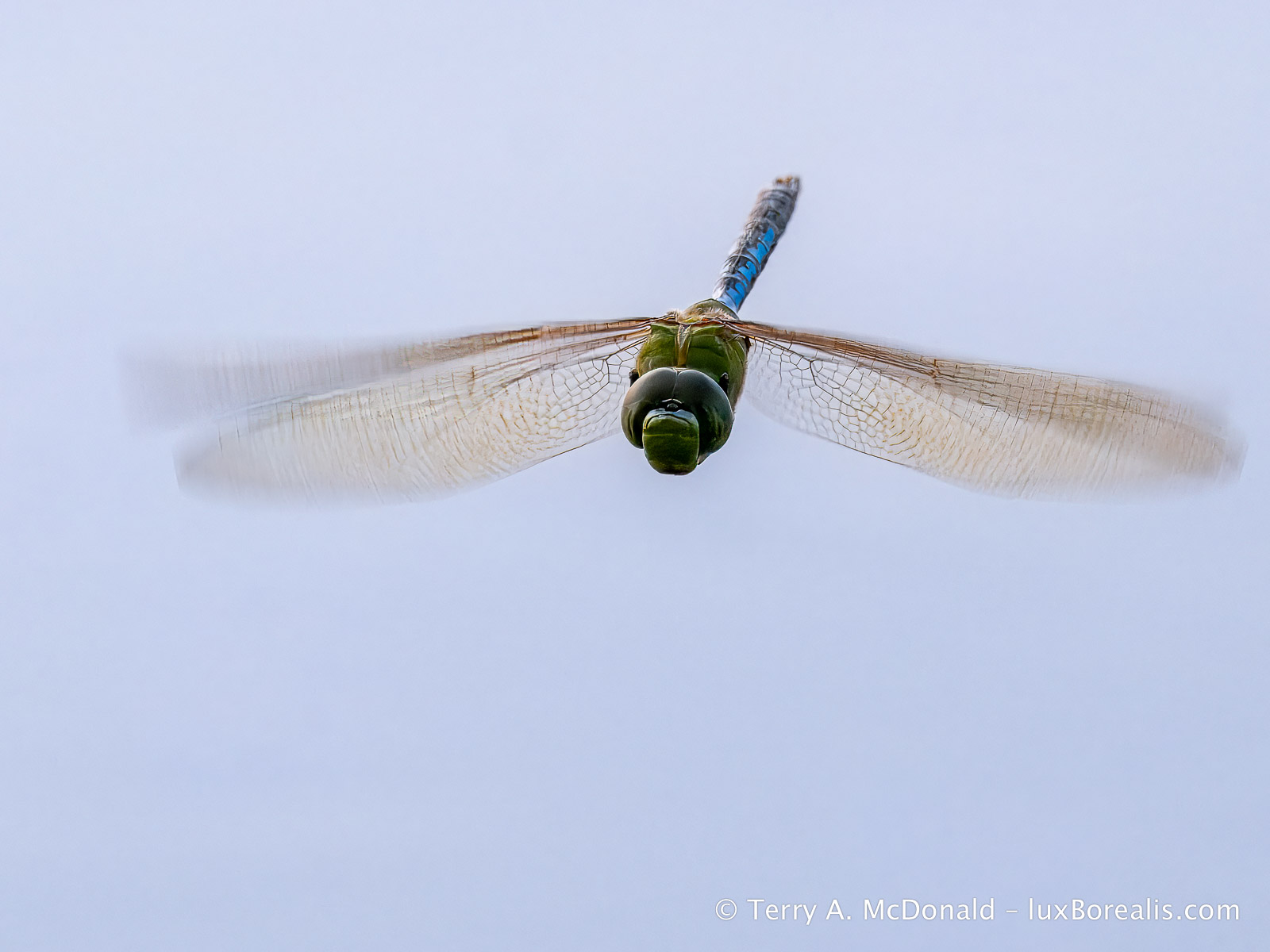 Topaz to the rescue! Caught on-the-wing, focus is bang-on for the thorax, but the eyes were soft. Processing began in Topaz Photo with Raw Denoise (Standard) and Sharpening (Subject – Motion Blur). The eyes were brought into ‘focus’ using a second sharpening layer masked specifically for the head, set to ‘Refocus’. After exporting the file as a DNG, it was re-imported into Lightroom where exposure and colour balance adjustments were made, which included a ‘Sky’ mask layer.