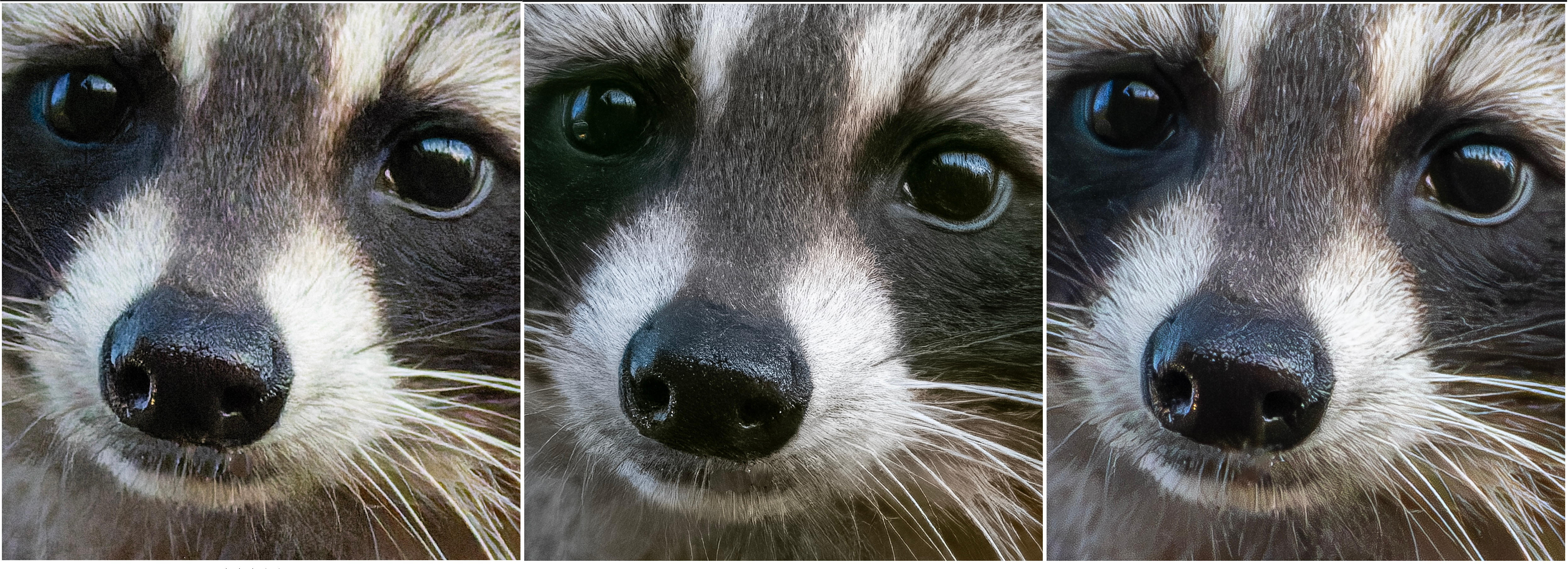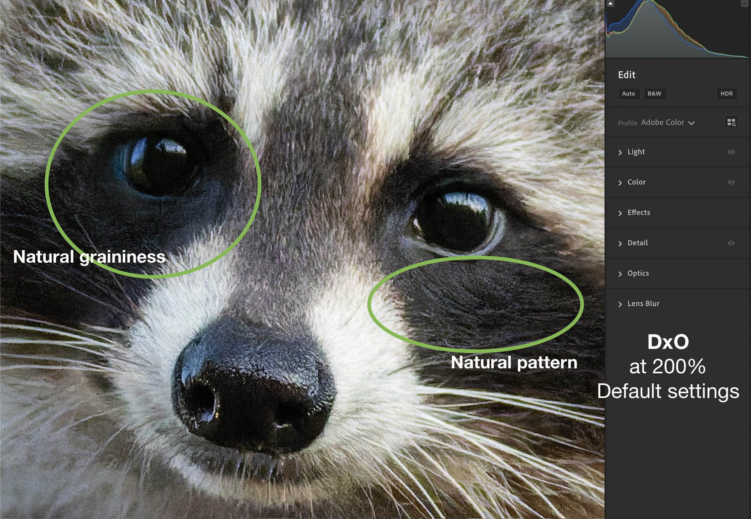 Upon opening, Topaz Photo applied ‘RAW denoise’, choosing RAW Strong which provided a clearer result than RAW Normal. No problem, though it now needed some sharpening. Except, with the snout being very bright, it needed some exposure adjustment first to allow me to see how sharpening would be applied to the bright areas. I used Adjust lighting v2 and the image became overexposed with all highlight detail wiped out. I also discovered how aggressive the changes to Exposure are with –0.5 making it quite dark, rather more than the –½ EV a photographer might expect. The changes to highlights were maxed out at –1.0, much more than –1 EV.