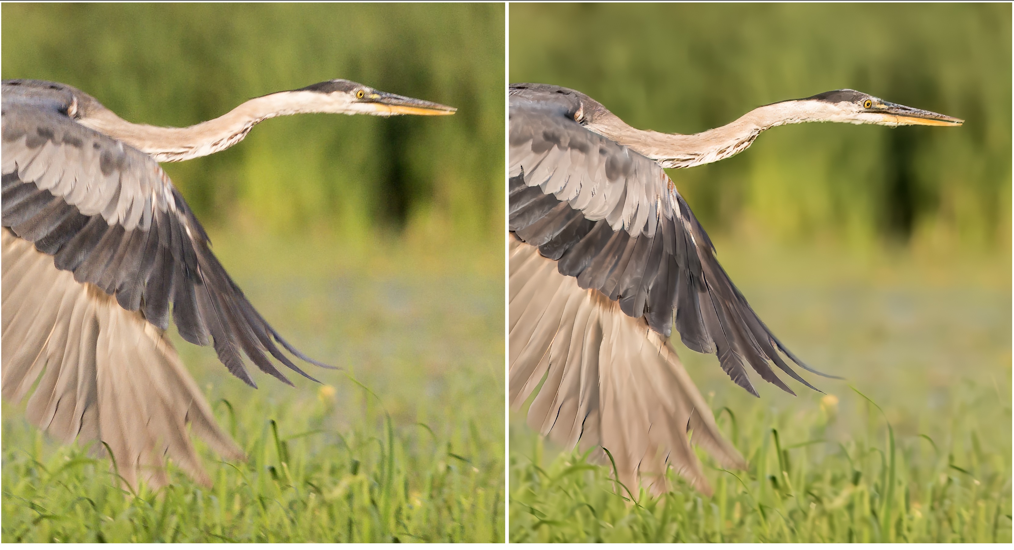 The Great Blue Heron photo is a near-perfect image. Cropped from the 36 MP sensor of the D800E, it shows slight motion blur in the head in addition to the significant, intentional blur of the wings. Initial processing of Raw Denoise and Sharpen went smoothly in Topaz Photo. However, I noticed that once Upscaling is invoked, Topaz Photo flattens the previous Sharpen and Raw Denoise layers. This was slightly annoying as the first thing I noticed upon upscaling was that a different sharpening method might produce better results. That meant deleting the Upscale filter, changing the sharpening, then starting fresh again with Upscaling. It’s unfortunate, the Upscale filter cannot be worked into the overall workflow as Super Resolution is with Lightroom. It was minor delay, but one worth pointing out. As It turned out, the different sharpening I chose (Standard) looked worse, so I went back to the original (Wildlife BETA) and upscaled from there.