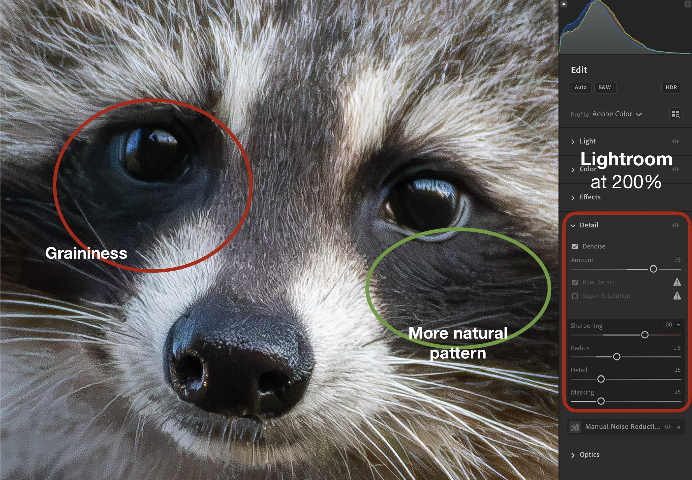 Upon further investigation, I learned that it’s not just Raw Denoise and Sharpen that use AI, Adjust light and Balance color are using AI models, hence the lag-time after each selection. I’m not against the use of Assistive AI like this, but when decisions are being made in a black-box, with no context, and it takes longer to show me the result, and the results are sub-par, I get annoyed. The underlying assumption when using AI for decisions like these is that the results will at least have artistic merit. But, that’s where it all breaks down.