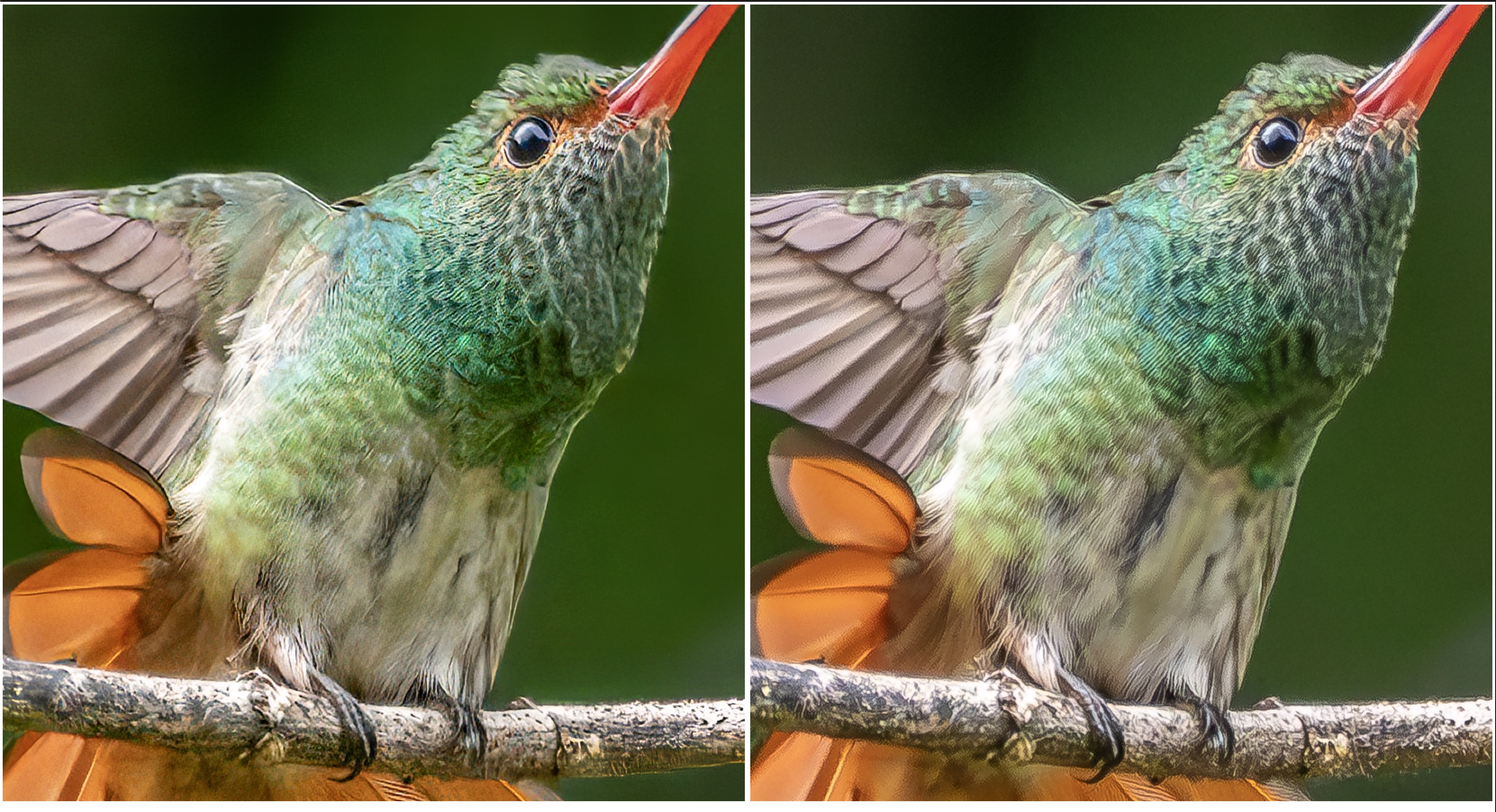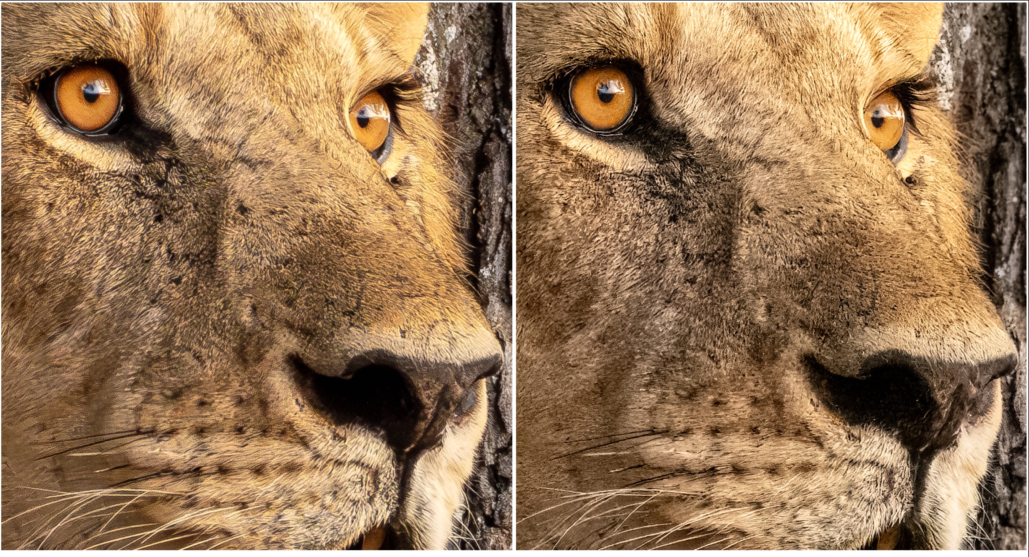 So I’ve left you in suspense, or have you figured out which one is which? Left is Topaz Photo; right is Lightroom. The discrepancies are so small that for anything other than a full-size fine print, i.e. for online, screen, photo books and calendars, the difference would be indistinguishable. For a full-size fine print, side-by-side, one would see differences. However, if they were not compared side-by-side, I doubt anyone would find fault with either result.
