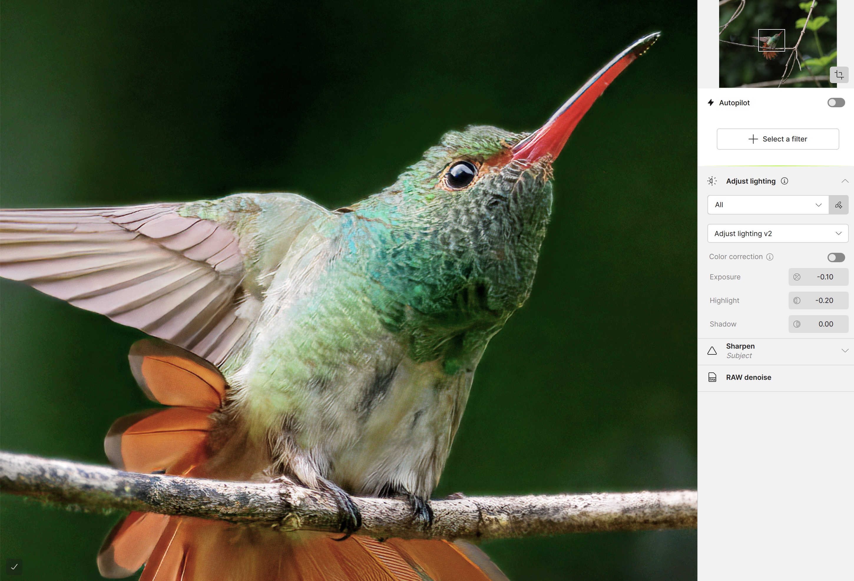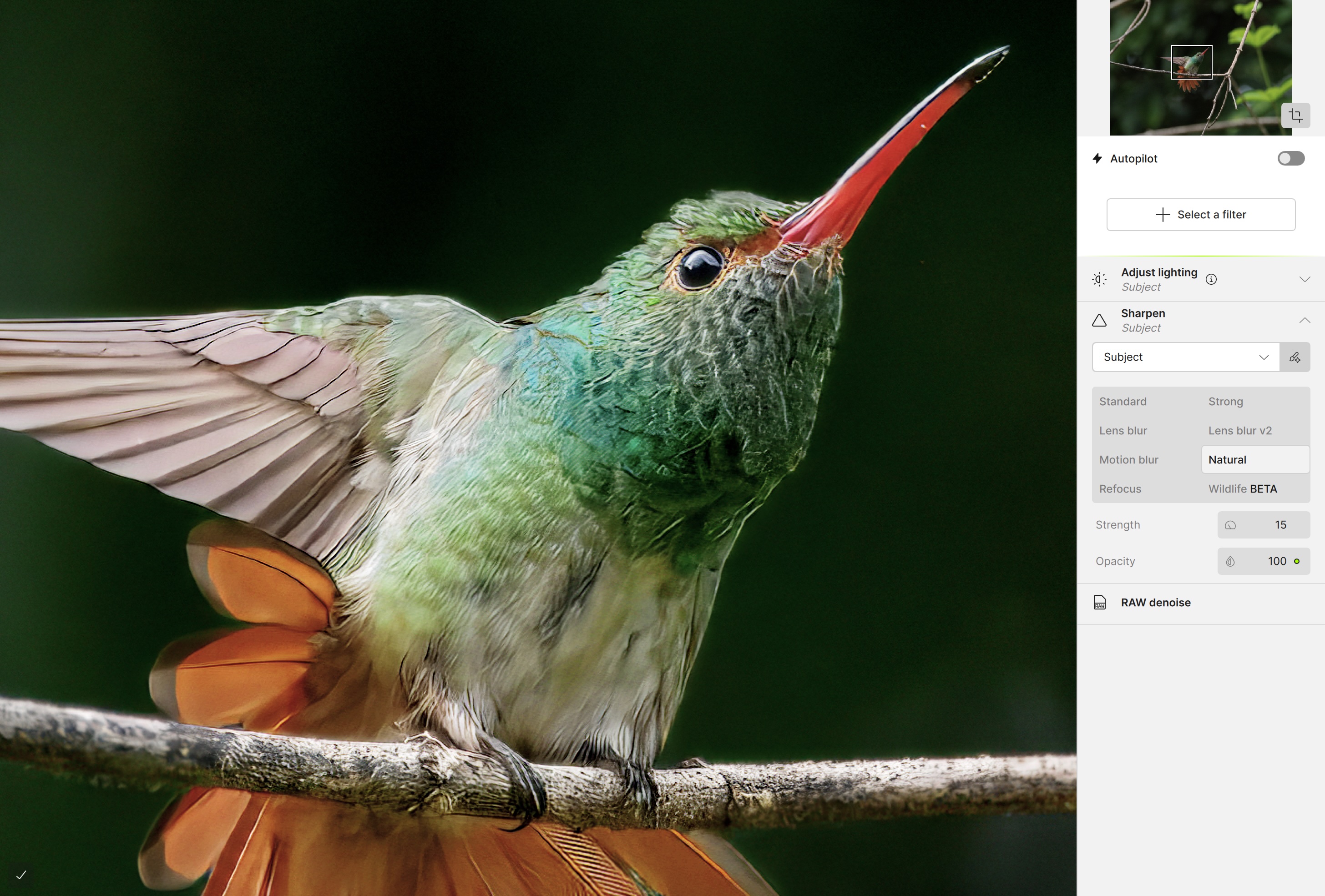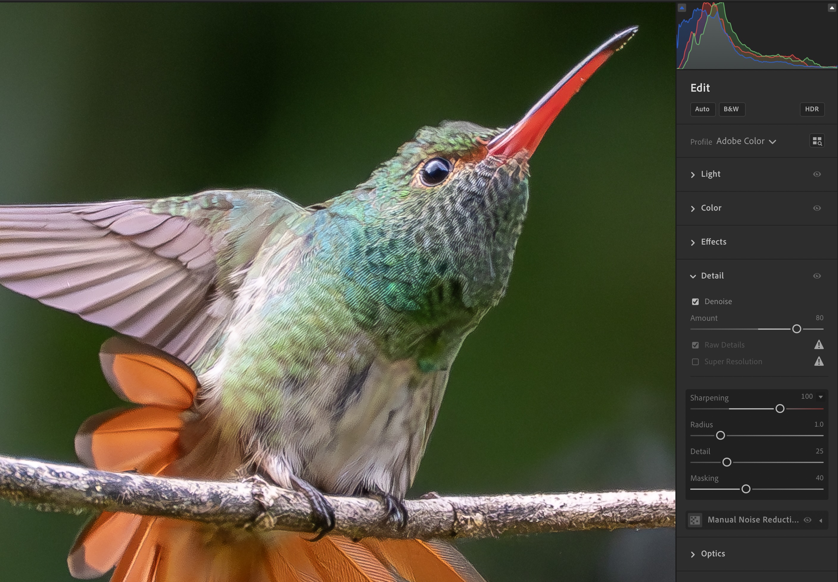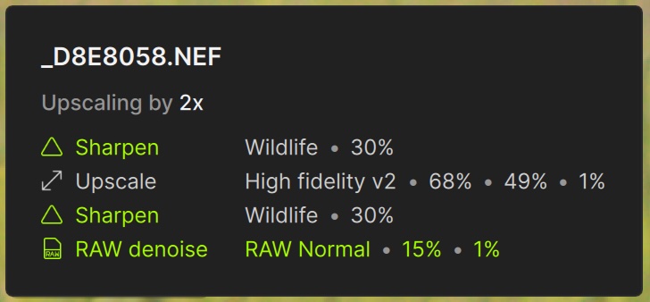 It took some work on my part, as the original photo appeared dark, though it was correctly exposed to preserve highlight detail. As a result, feather details were not entirely clear in the on-screen Preview. To improve that, I temporarily used Adjust lighting to bump the shadows, then turned it off before exporting the final DNG (to keep it as a DNG and not a TIFF). Upon exporting, the DNGs typically appeared over-sharpened compared to the on-screen Preview. Unexpectedly, the image also required an additional Denoise filter, specifically to smooth the mottling of the background. Therefore, my trial-and-error result was time-consuming and required a total of eight DNGs at different settings to match what I had achieved in Lightroom.
