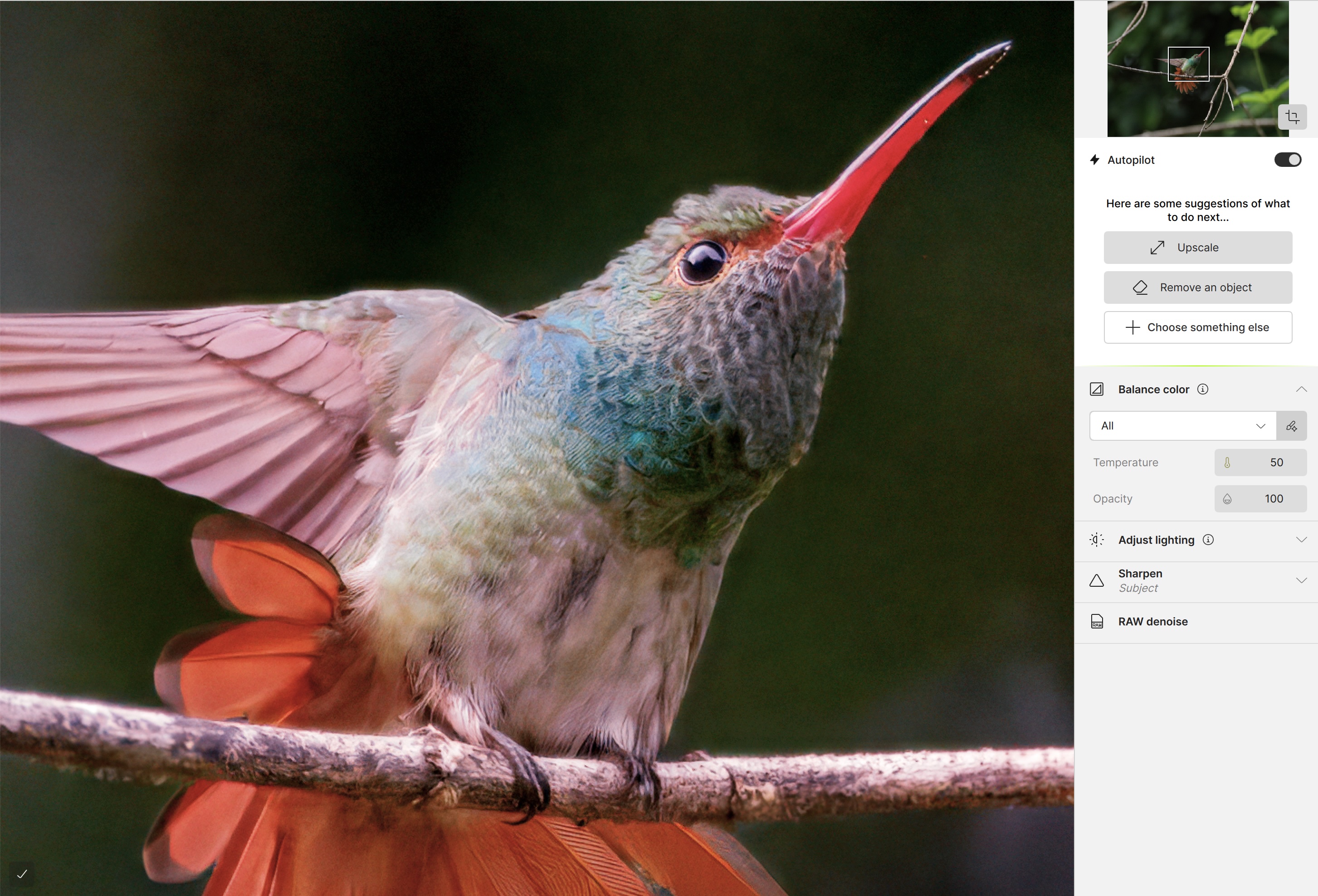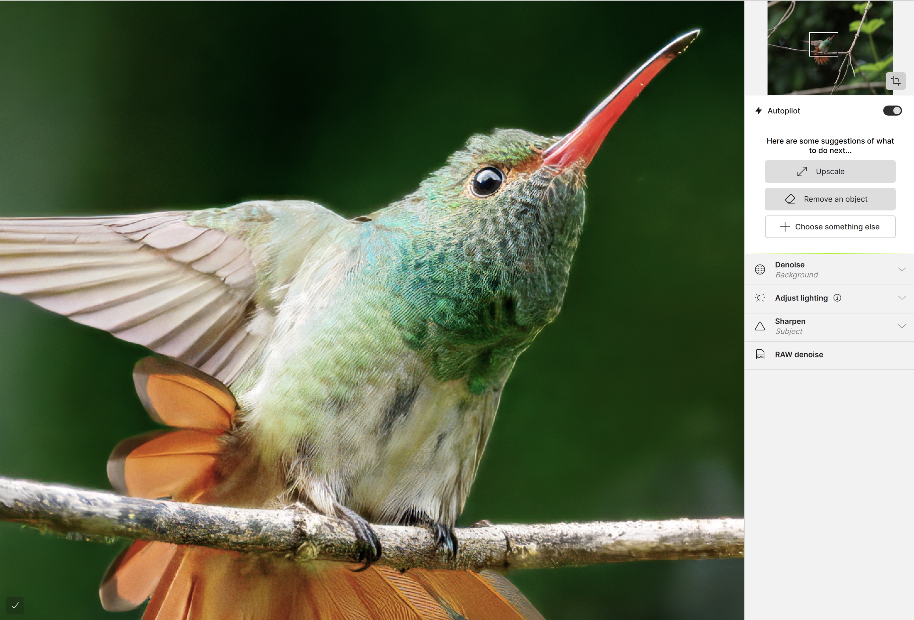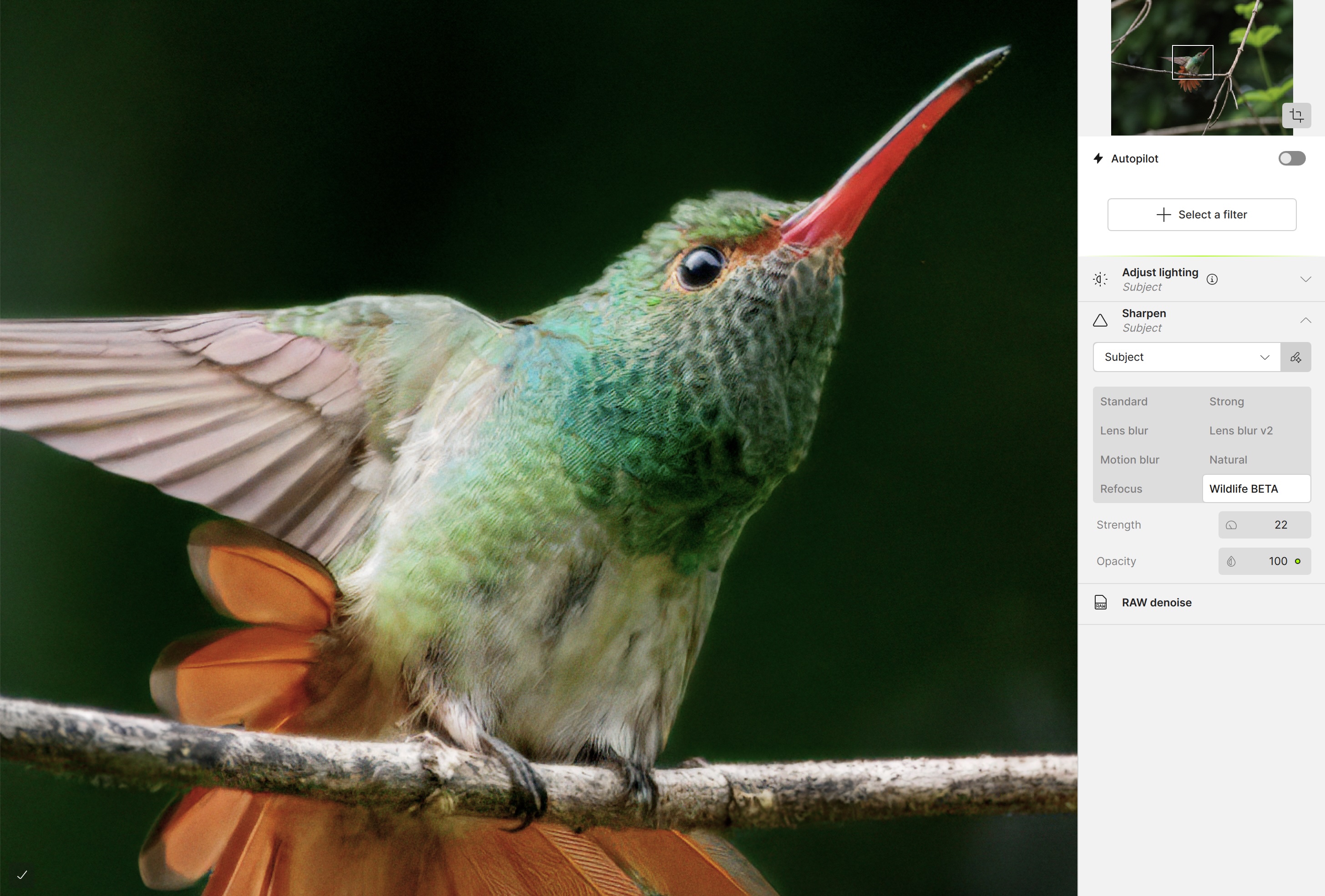 It took some work on my part, as the original photo appeared dark, though it was correctly exposed to preserve highlight detail. As a result, feather details were not entirely clear in the on-screen Preview. To improve that, I temporarily used Adjust lighting to bump the shadows, then turned it off before exporting the final DNG (to keep it as a DNG and not a TIFF). Upon exporting, the DNGs typically appeared over-sharpened compared to the on-screen Preview. Unexpectedly, the image also required an additional Denoise filter, specifically to smooth the mottling of the background. Therefore, my trial-and-error result was time-consuming and required a total of eight DNGs at different settings to match what I had achieved in Lightroom.