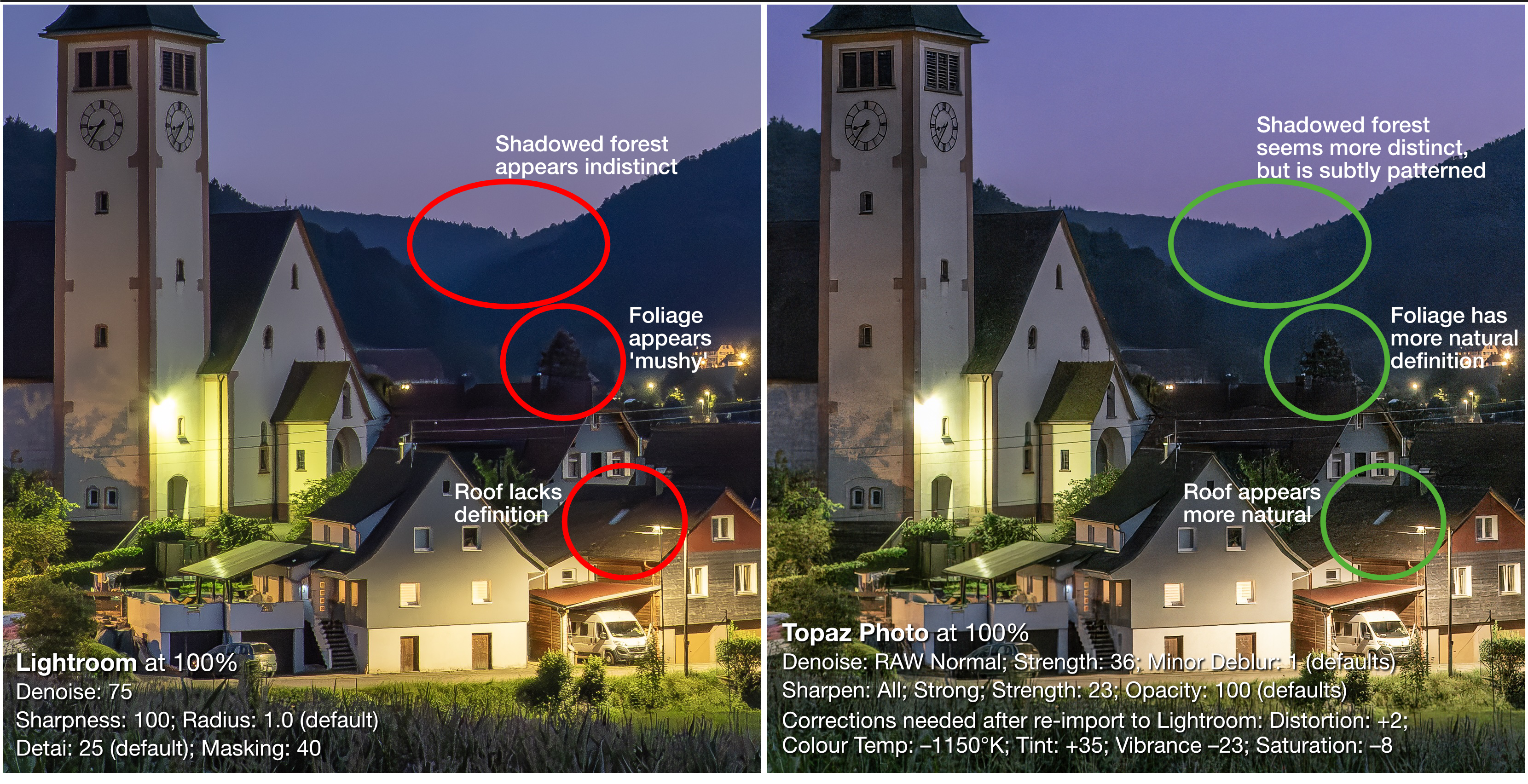 This is where Topaz Photo shines. When viewed at 100% as it would be printed to its full 5184×3888 size, equivalent to at 13×17″ print or a full-page in a calendar or photo book, Topaz Photo does a better job of maintaining detail in dark foliage and dark roof tops. The image below summarizes it successes.