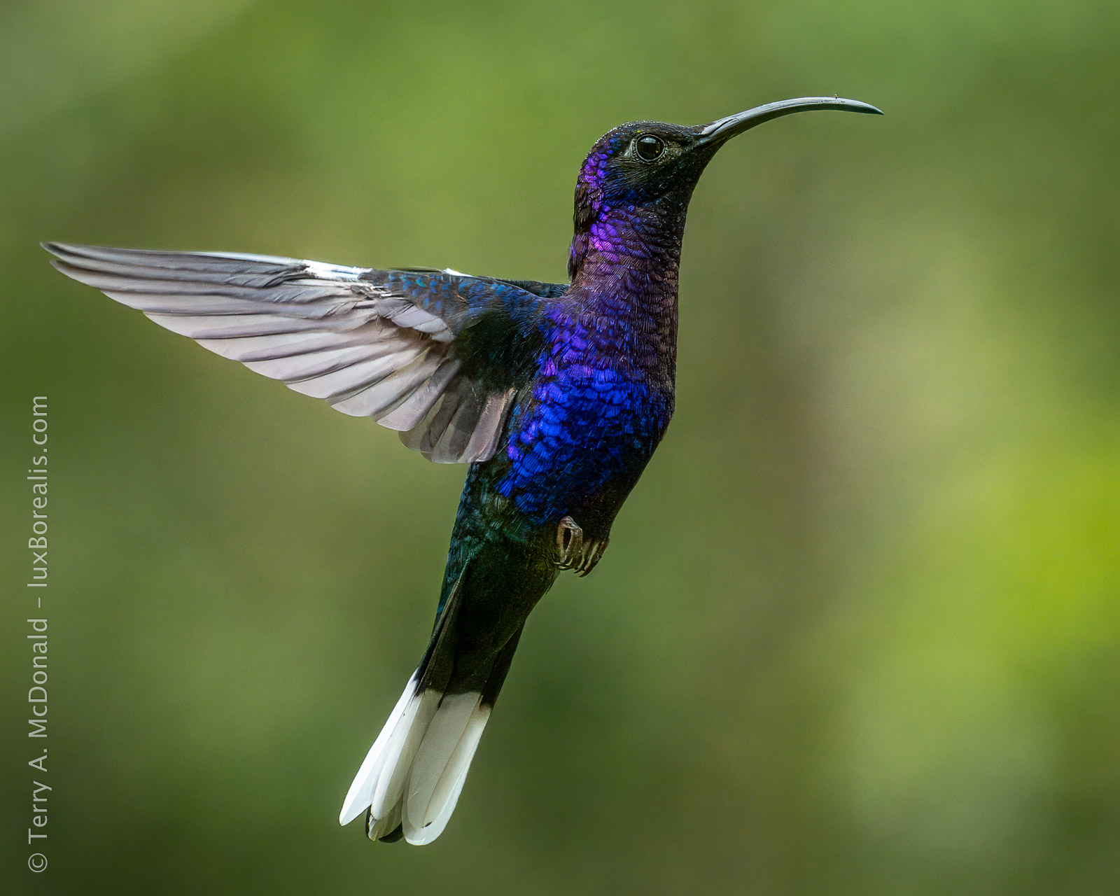 This fellow was on display for all to see. He would periodically fly between feeding at a flowering shrub to perch, then display, on this bare branch. It was an overcast day, ideal for allowing colours and feather detail to show without shadows. It also meant I needed to crank up the ISO to 6400 to maintain a shutter speed of 1/320, not really high enough to stop wing action. It is what it is.
