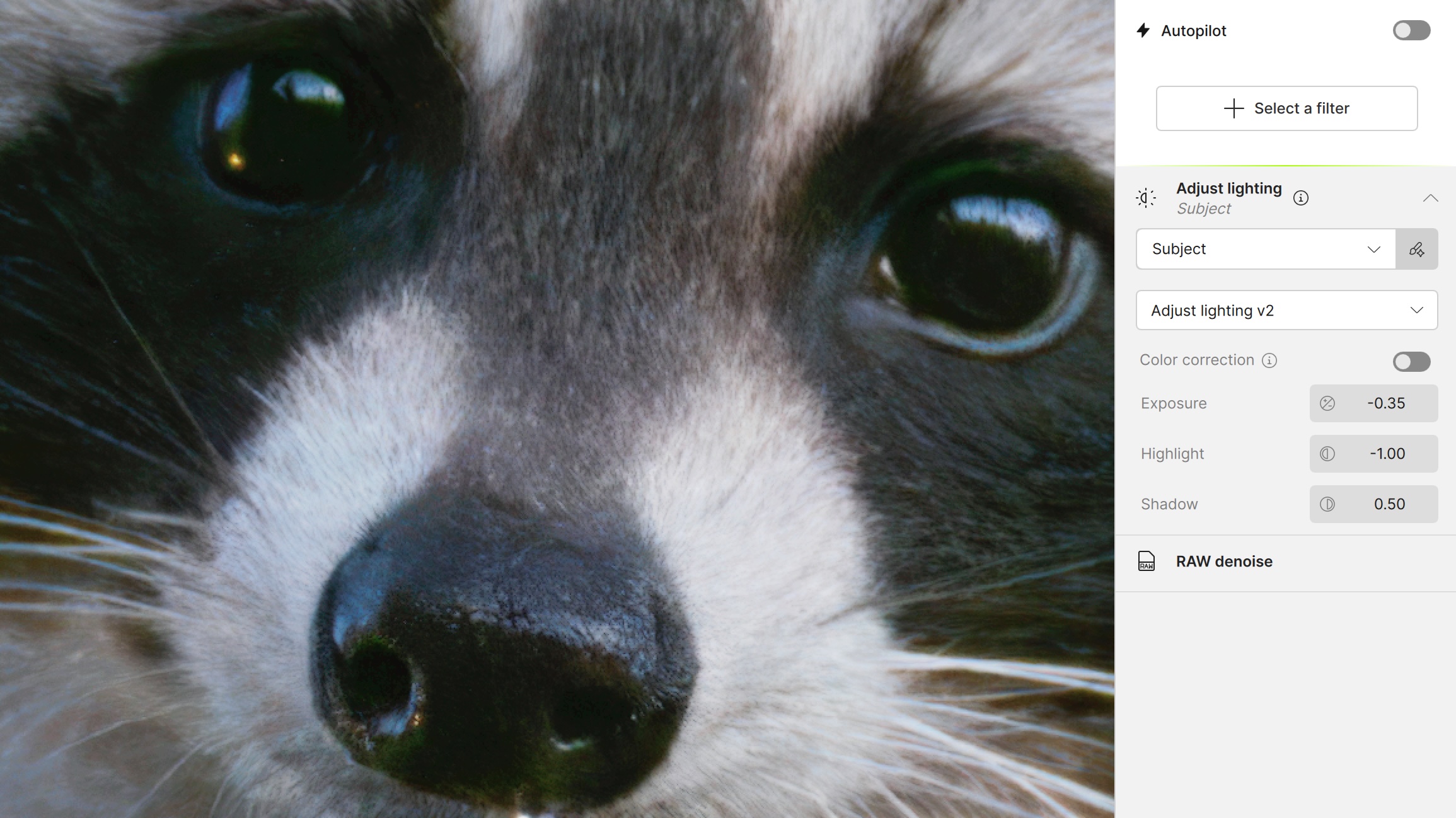 - With the area brushed (e.g. the yellow reflection in the raccoon’s right eye), the actual process of removing took forever. What is instantaneous in Lightroom took 20 seconds or so.