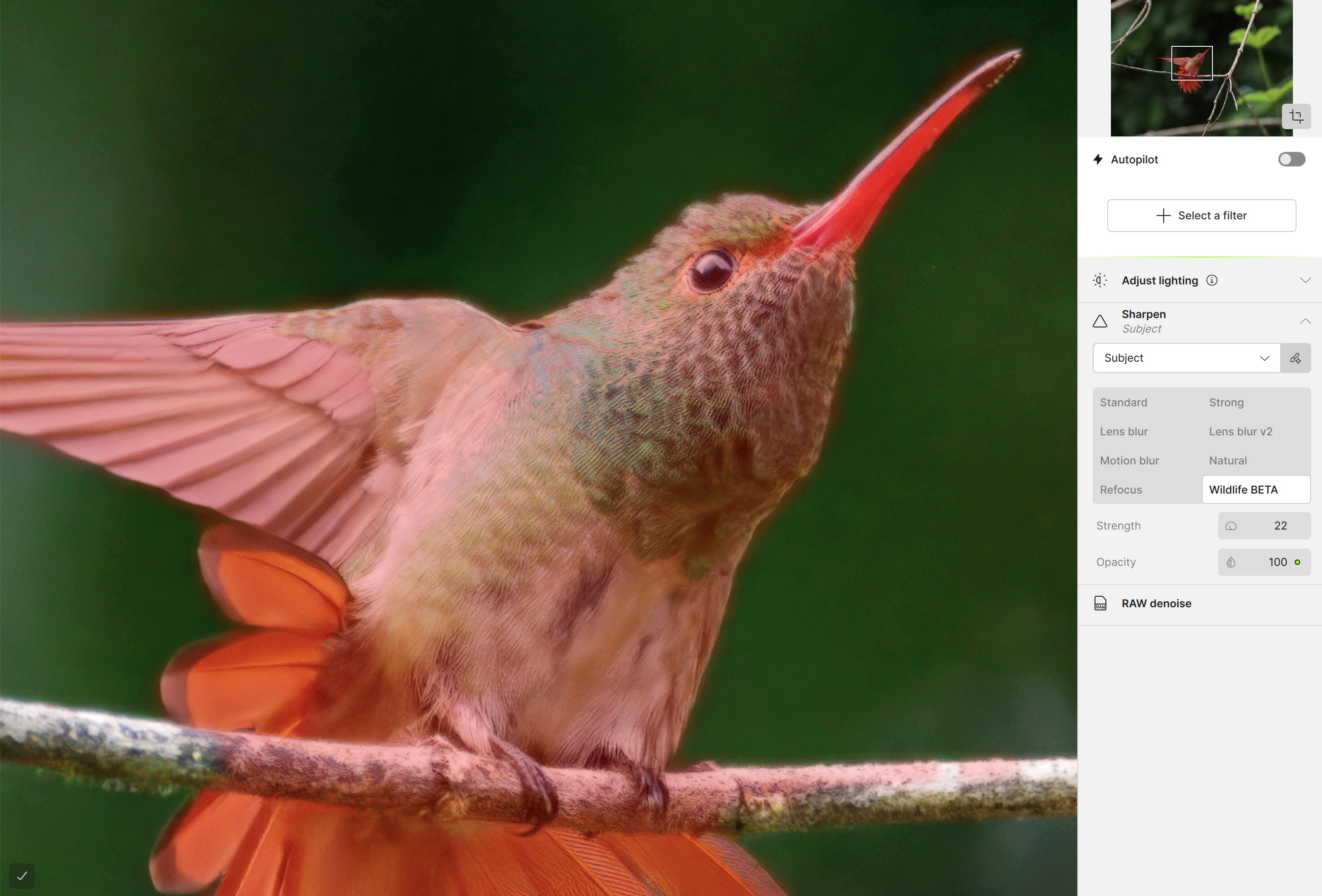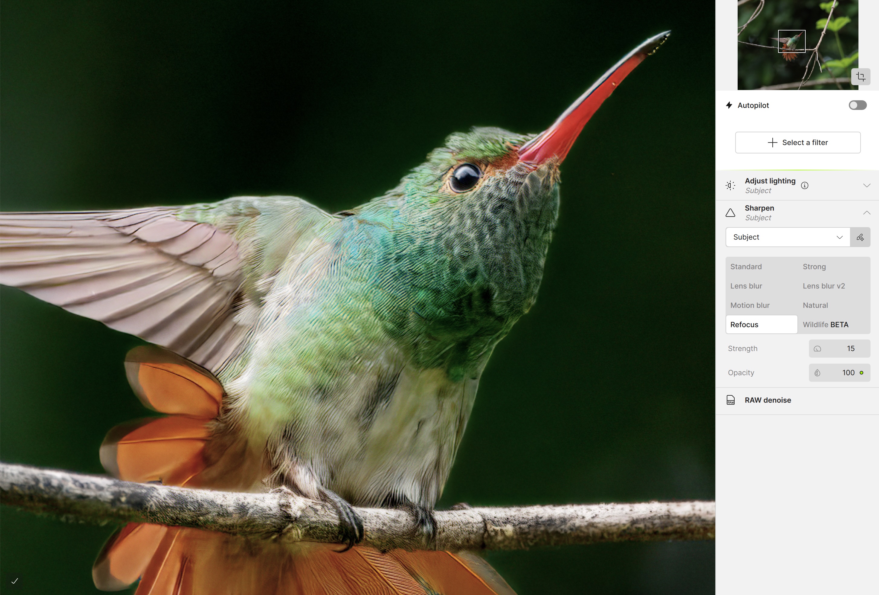 When I opened the raw file in Topaz Photo, the app did an excellent job of Denoising the image, maintaining good feather detail while appropriately smoothing out the out-of-focus background, though I did notice some mottling of the background. When I selected Sharpening from the list of Filters, Topaz made a fairly accurate subject mask to ensure just the detailed areas received sharpening. Great. One less step for me.