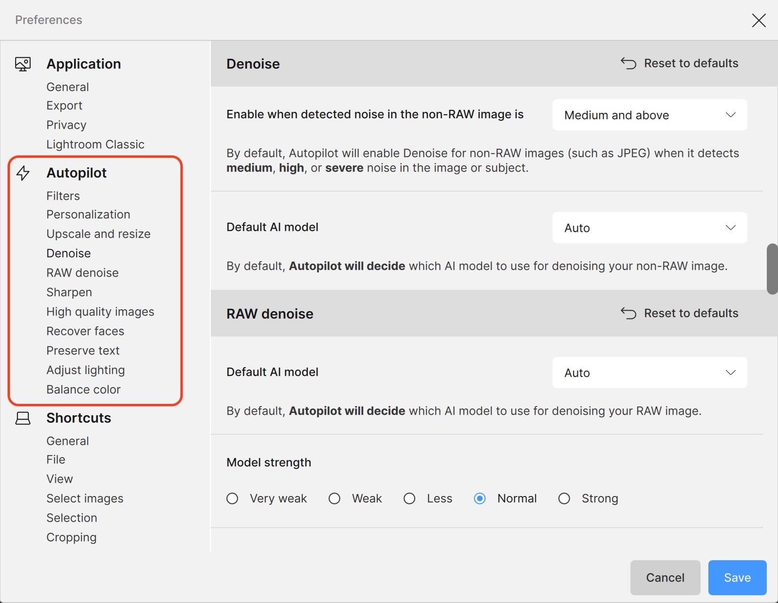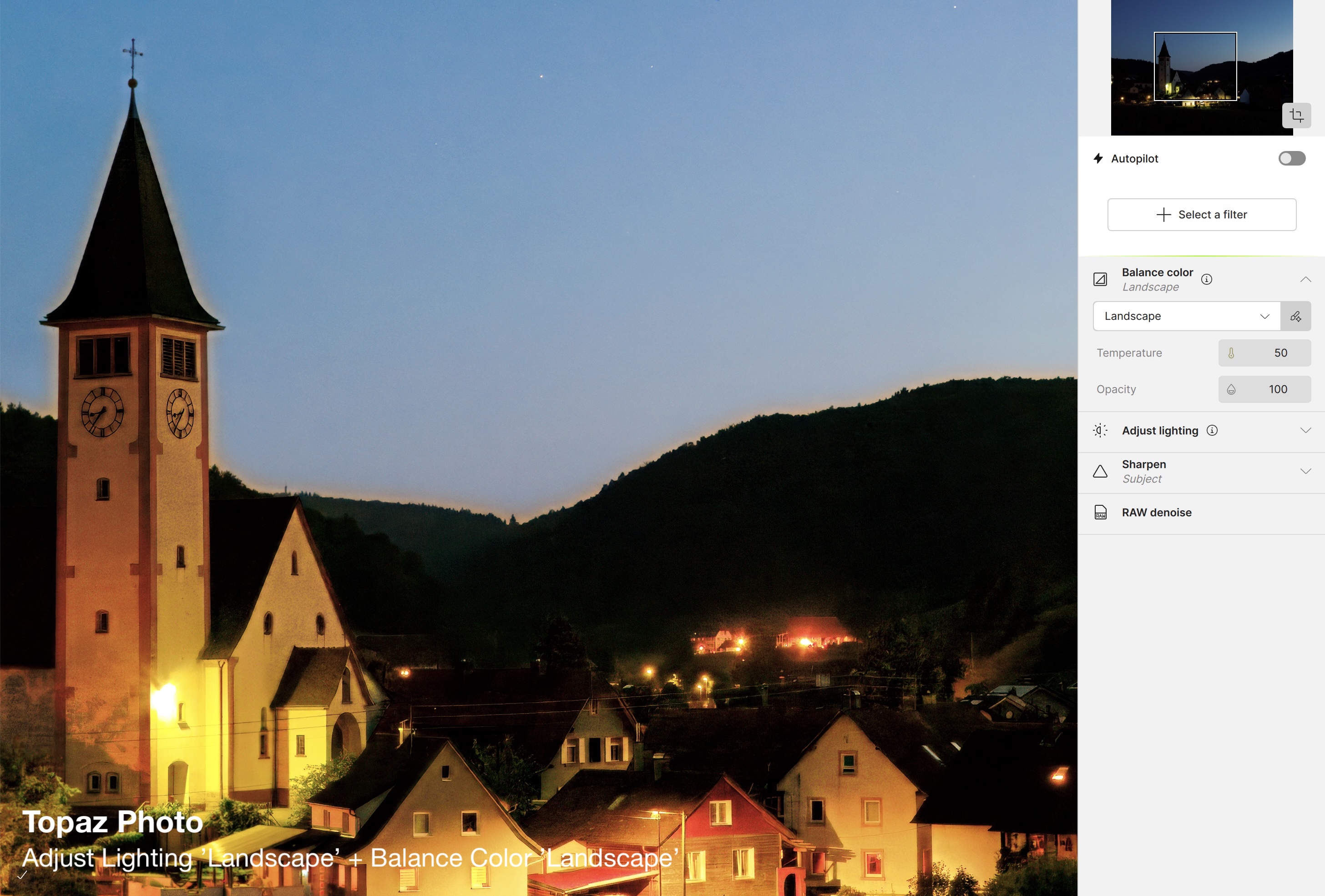 So, let’s have a look at what Topaz Photo Autopilot does, compared to Lightroom’s auto Light, auto Color and auto Denoise.