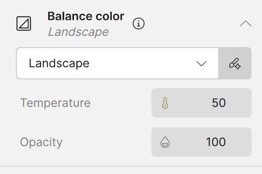 As with ‘Adjust lighting’, Balance color can be applied to ‘All’ or ‘Subject’ or ‘Landscape’ or ‘Portrait’ (and others). This is helpful, but once applied, the only two user options are Temperature, which is not stated as industry-standard °K, and Opacity. There is no option for Tint, Vibrance or Saturation. And, I wonder, how is colour balance being determined in the first place? It turns out, by AI, but more on that later. As with Adjust lighting, when Balance color is used, raw files can only exported as TIF files. Again, not good.