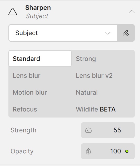 Under Sharpen, there are eight push-button options, each with only Strength and Opacity as options. Nowhere is there the more industry-standard Radius and Masking or Threshold, for example.