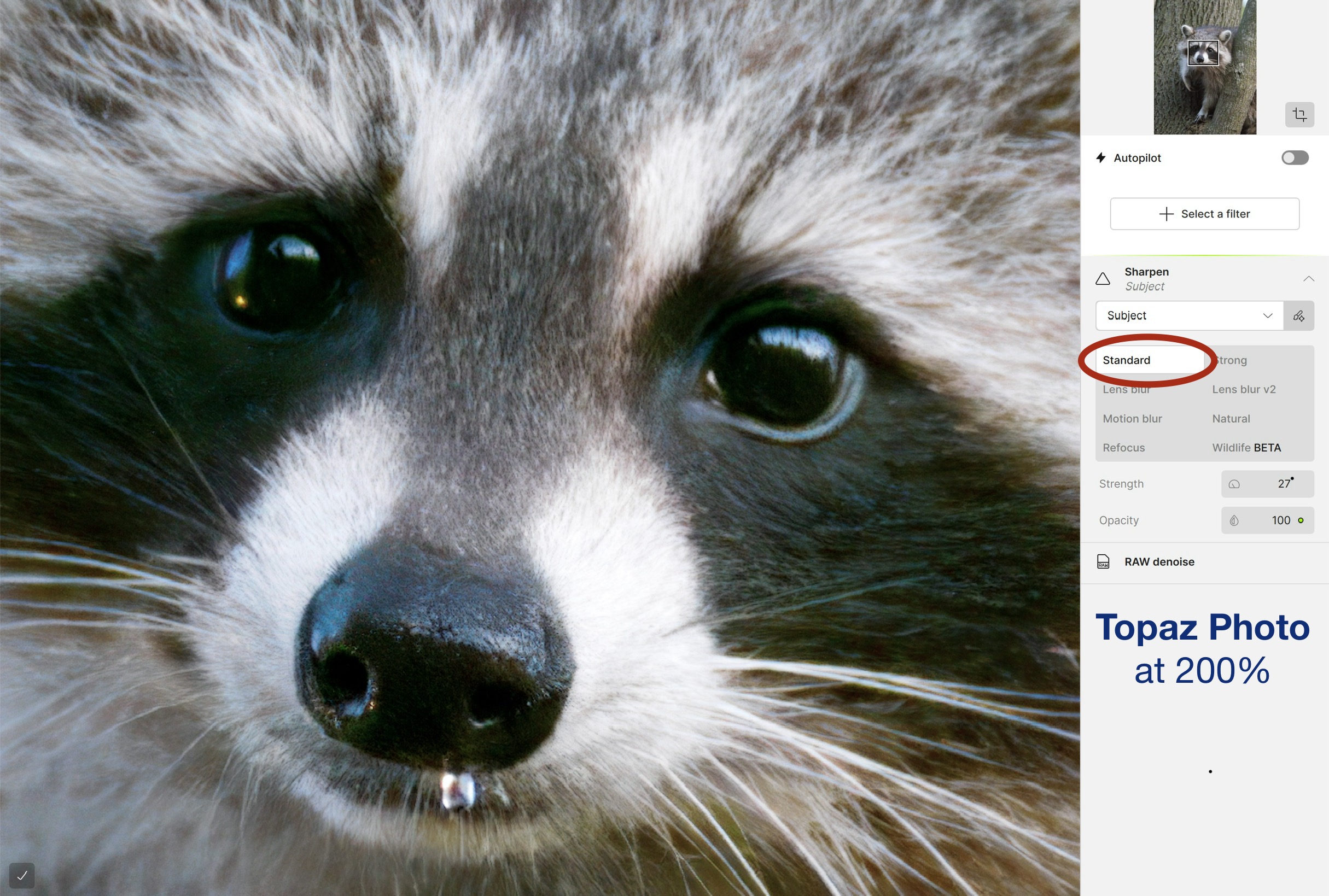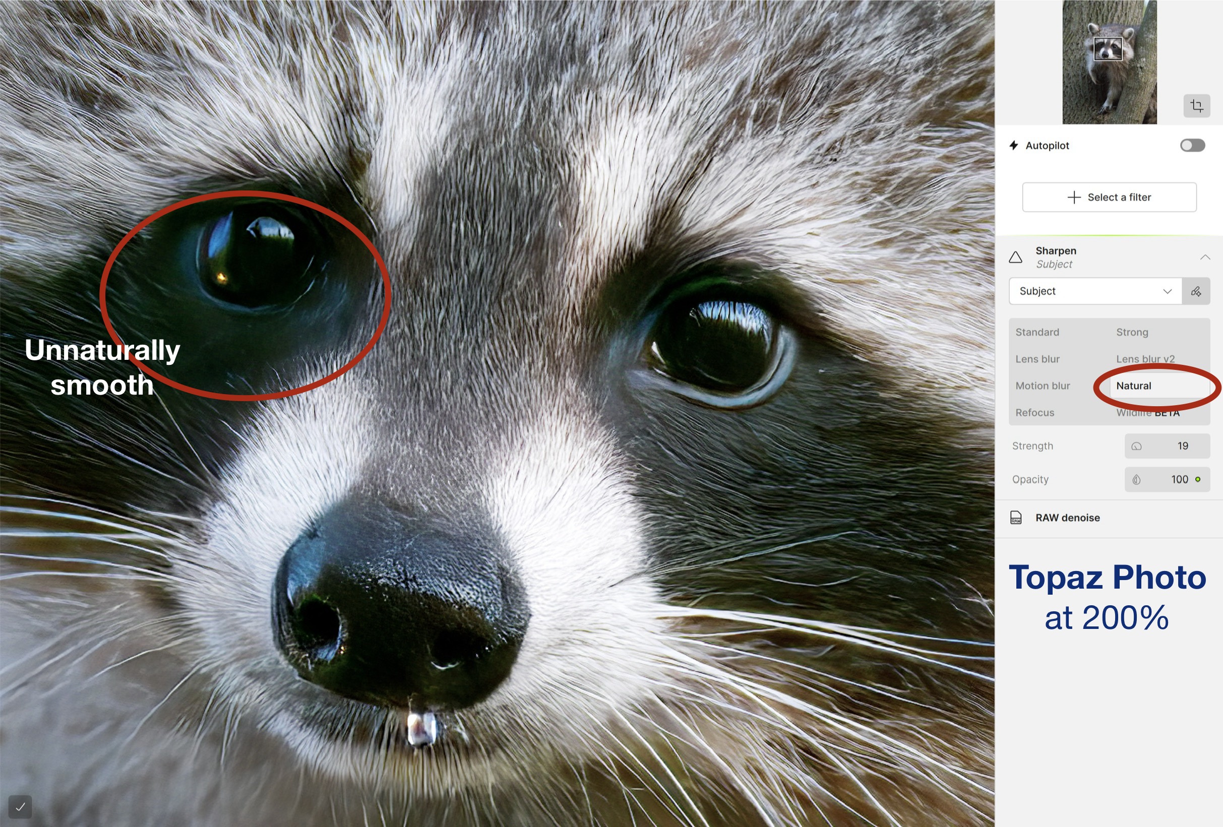 With the variety of Sharpening options to choose from, which one to choose? I ended up going through each one to see how subtle or aggressive they were. I was pleased to see a ‘Wildlife BETA’ option. In the past, I’ve written about how artificial Topaz PhotoAI sharpening was when it came to fur and feathers. It added patterns that weren’t there, making fur and feathers appear ‘combed’ or ‘groomed’ like a pet might be, but certainly not wildlife. While, I couldn’t really see any appreciable difference between Standard or Strong, Wildlife was significantly more natural-looking than ‘Natural’, so there has been some progress.