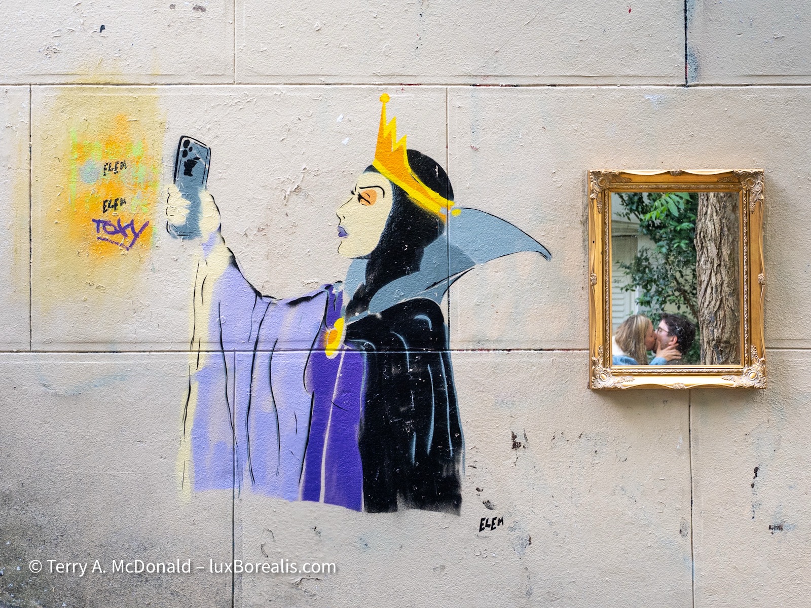 I enjoy photographing street art in Paris and this juxtaposition of the fairy tail, the mobile phone and the mirror—not my creation—caught my eye. It was serendipity that brought the two Paris lovers together in a kiss.
