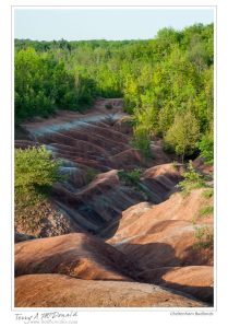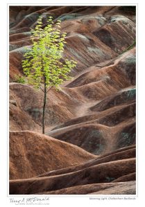 Cheltenham Badlands are a small and rather unique feature along the Niagara Escarpment of exposed and eroded “red” and “green” Queenston shales. While you won’t find any hoodoos like there are out west (Alberta Badlands, Yoho National Park hoodoos and US Badlands), the colours, textures and contrasts of the undulations and hummocks are wonderful subjects in themselves. I prefer the subtle lighting of early morning before there is direct sunshine on the site, however, with a keen eye, dramatic photos can be made at any time of day and season.