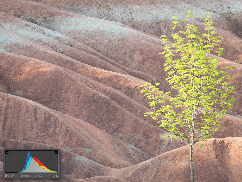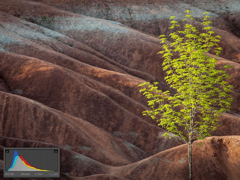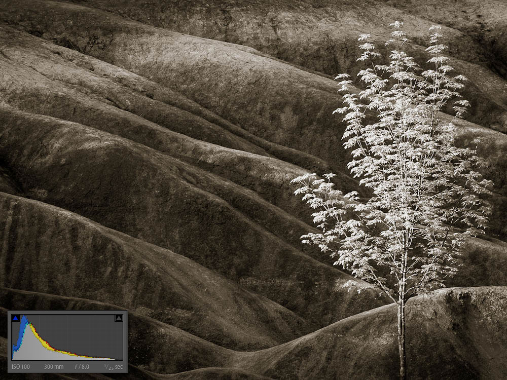 All shots were made on tripod allowing the use of small apertures for great depth-of-field. Shutter speeds ranged from a few seconds to about 1/40th. Most of the raw images were exposed-to-the-right creating distinctly washed out images that retained full detail without the spectre of noise in the shadows. Here is a “before” and “after” sequence, along with the histogram for each, to give you a sense of how this works. After editing the colour version, I went on to create a black-and-white version that I also added some subtle brown/sepia toning to.