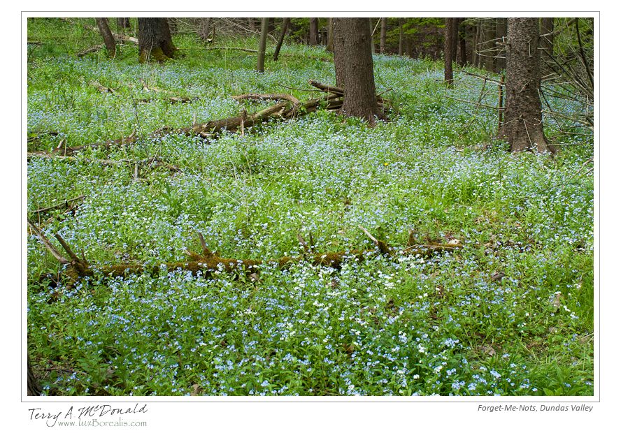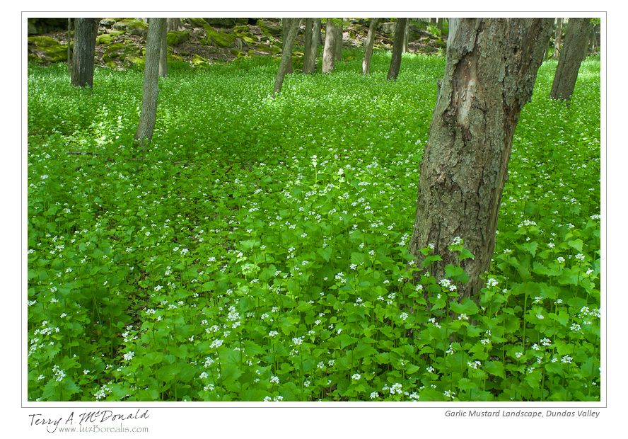 To me, this is discouraging in such a typically bountiful area as the Dundas Valley. While there were many patches of mayapples, we saw only one clump of trilliums. While one could argue the flowers were finished early, there weren’t even any tell-tale clumps of leaves of trillium plants. Even dog-toothed violets (trout lilies) were in short supply (no flowers, of course, as they are long gone, but very few scatterings of leaves). Instead, vast areas of the forest were covered by mats of either forget-me-not or garlic mustard. From a photographic stand point, these worked quite well, but as a naturalist, I am rather concerned that these aliens have choked out native species of this area.
