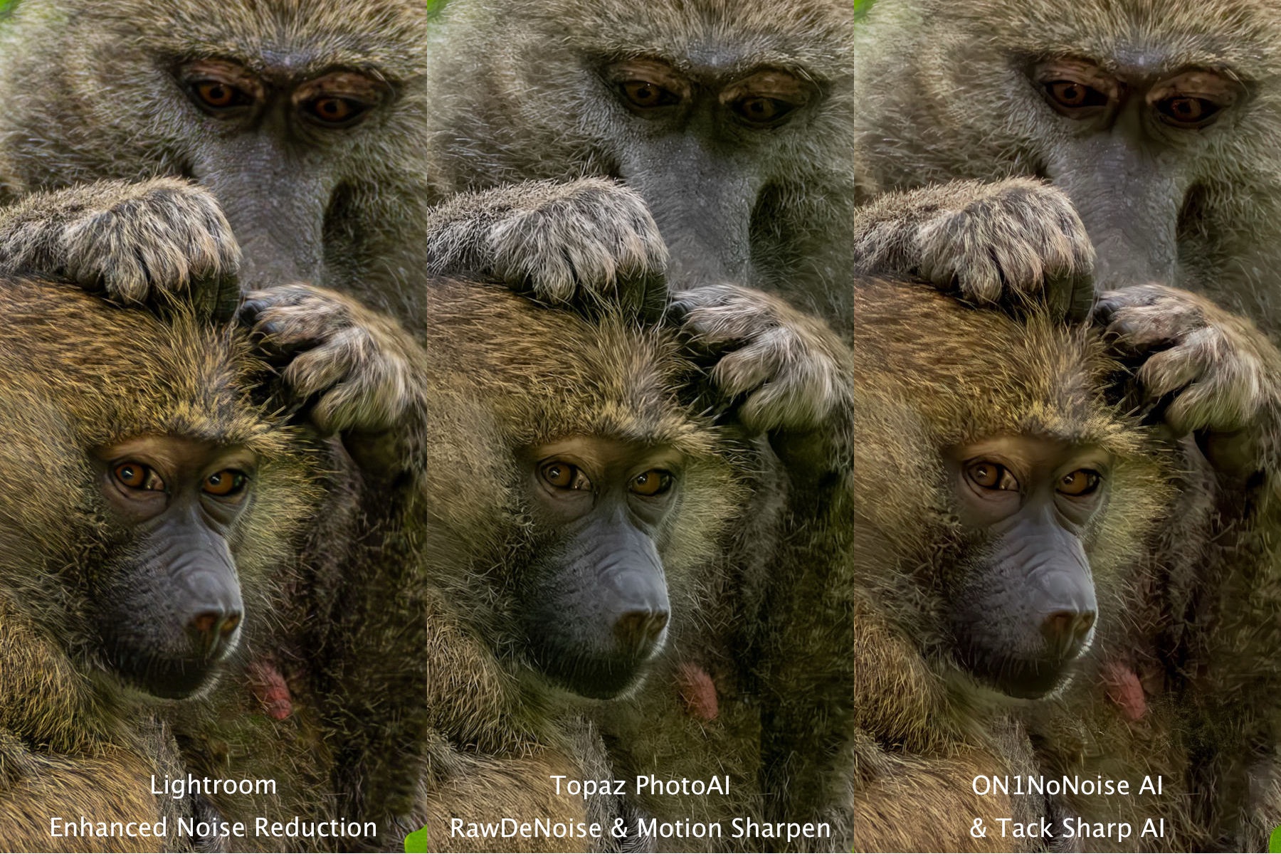 Baboons Grooming took a little more work. While the hair appears a bit coarse/crispy, the movement is mostly gone. Using the defaults produced an image with double fine hairs. By increasing both the ’Strength’ and the ’Minor Denoise’, this issue was partly solved, but not entirely. Back in Lightroom, I reduced Sharpening to ’0’ and I further reduced the crunchiness of the individual hairs by moving the Texture slider to -50, softening the coarse hairs into something more natural-looking.