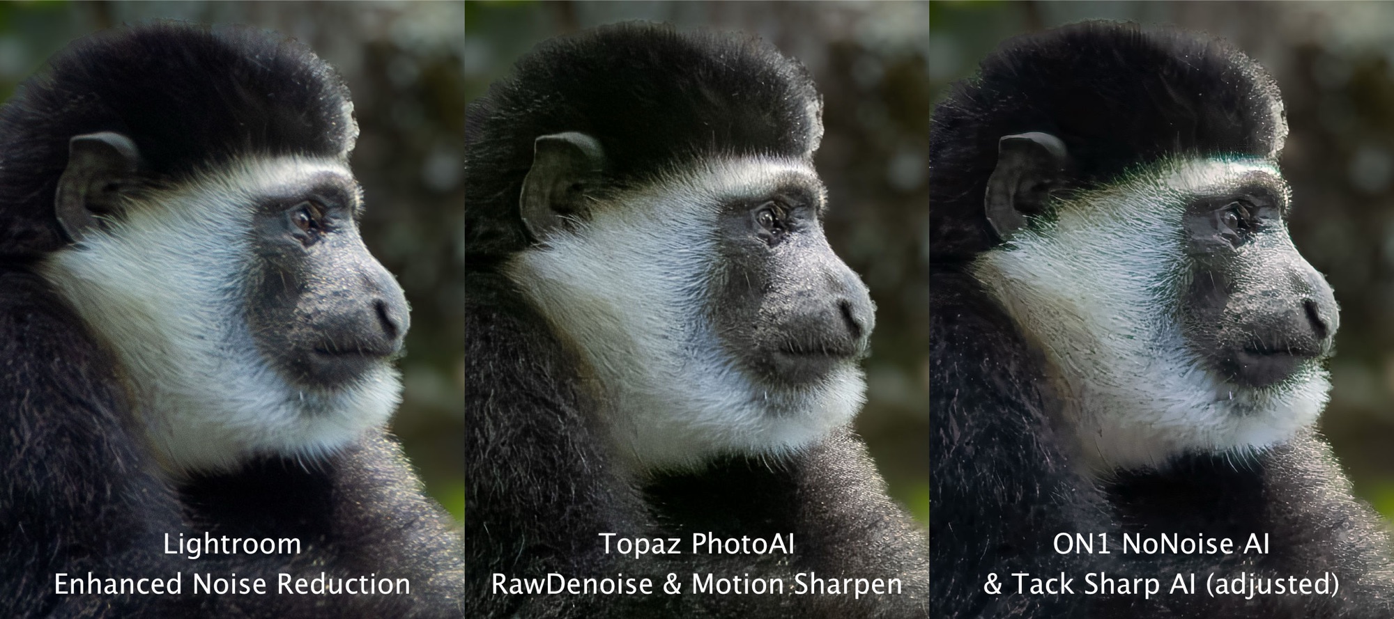 Overall, I prefer the Topaz results. To me, they appear cleaner, especially in the white cheek fur. The facial features also appear more natural. In the ON1 version, the facial features appear carved from wood or plasticine.