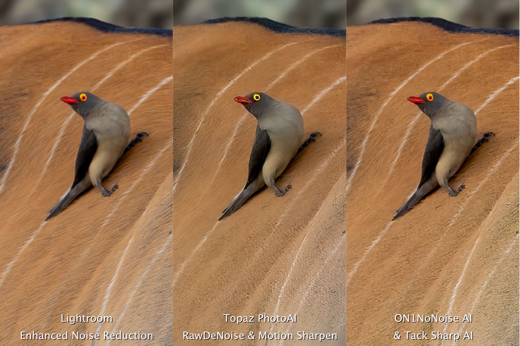 As far as which app to buy to correct blur . . . ? My go-to has become Topaz PhotoAI. It did an excellent job with the Colobus monkey and the Baboons. But a case could be made for ON1 No Noise, given its results for the Oxpecker photo. Depending on how often you need to correct and the types of correction needed, it may be helpful to have both in your arsenal.