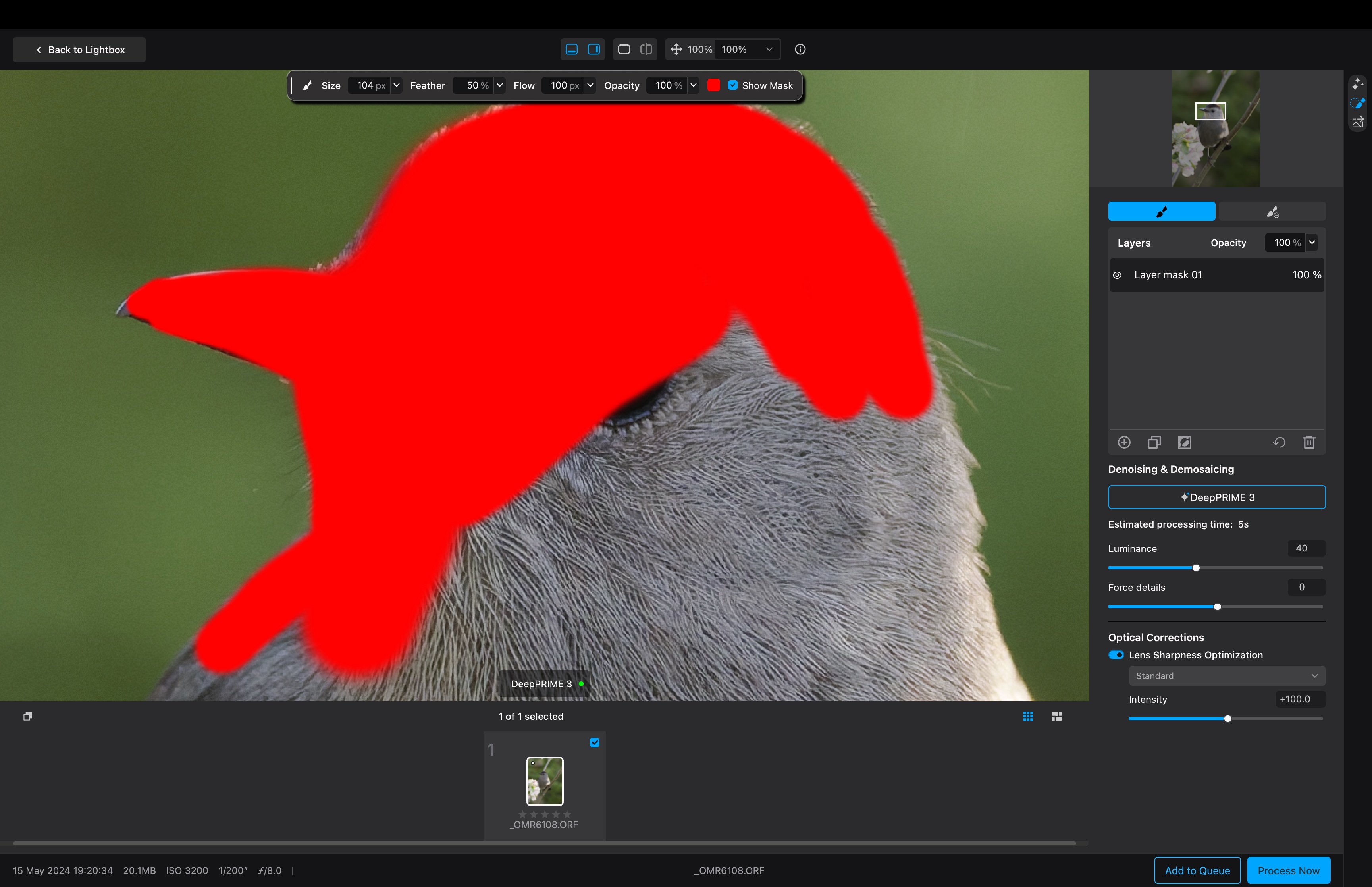The other issue with DxO PureRAW 5 is that, when painting in the mask, you can only set the view to either full or to 100%, nothing in between. I wanted 50%, to see more of the bird as I masked it, but nope, it was all or nothing, at least up on the settings bar at the top. I subsequently discovered I could un-pinch on my trackpad to zoom in. Okay, so other viewing options are available, but why not just have a selection of viewing %s in the top bar, say 25%, 50%, 67%?