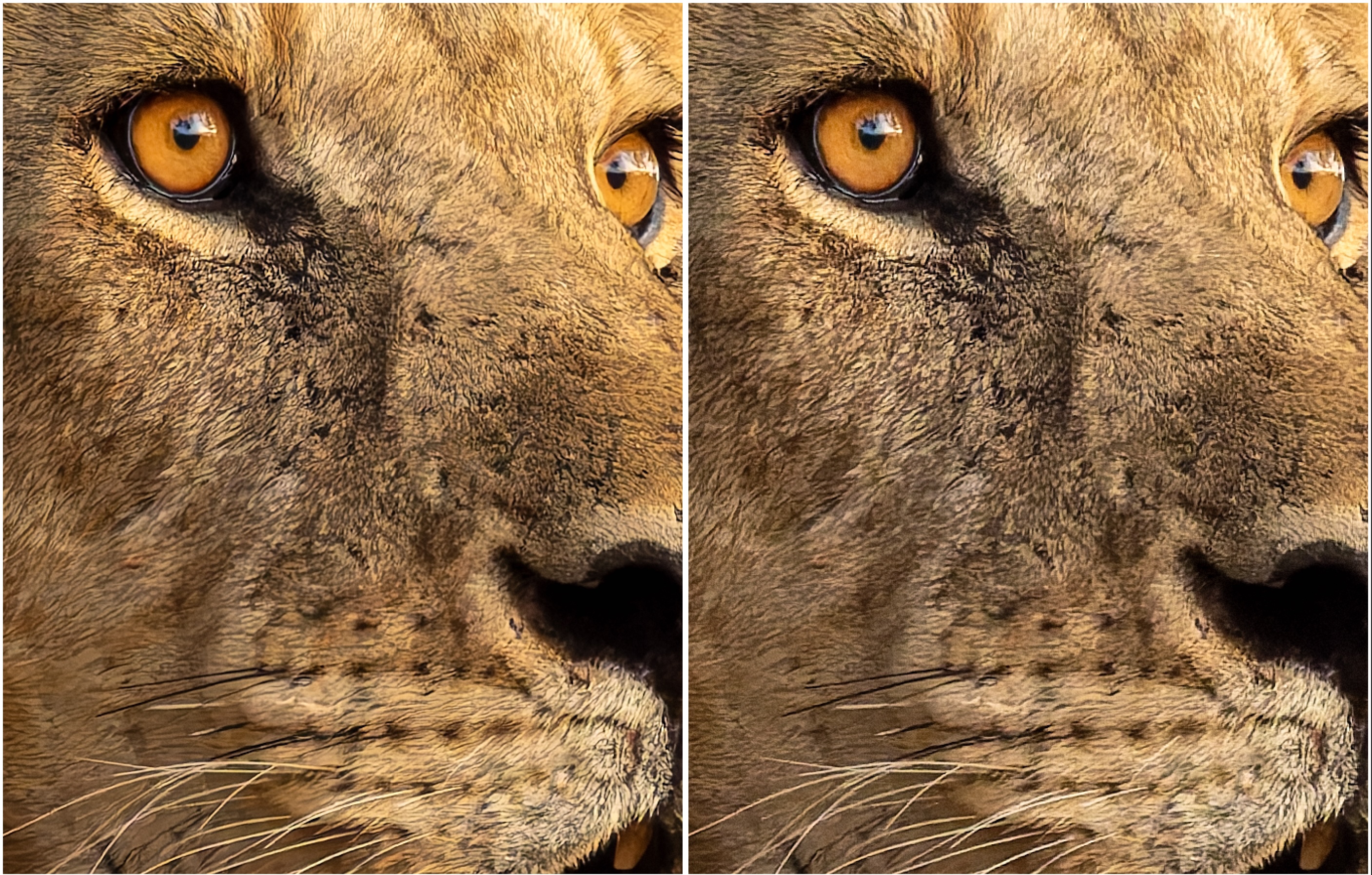 Overall, I prefer the Topaz results. To me, they appear cleaner, especially in the white cheek fur. The facial features also appear more natural. In the ON1 version, the facial features appear carved from wood or plasticine.